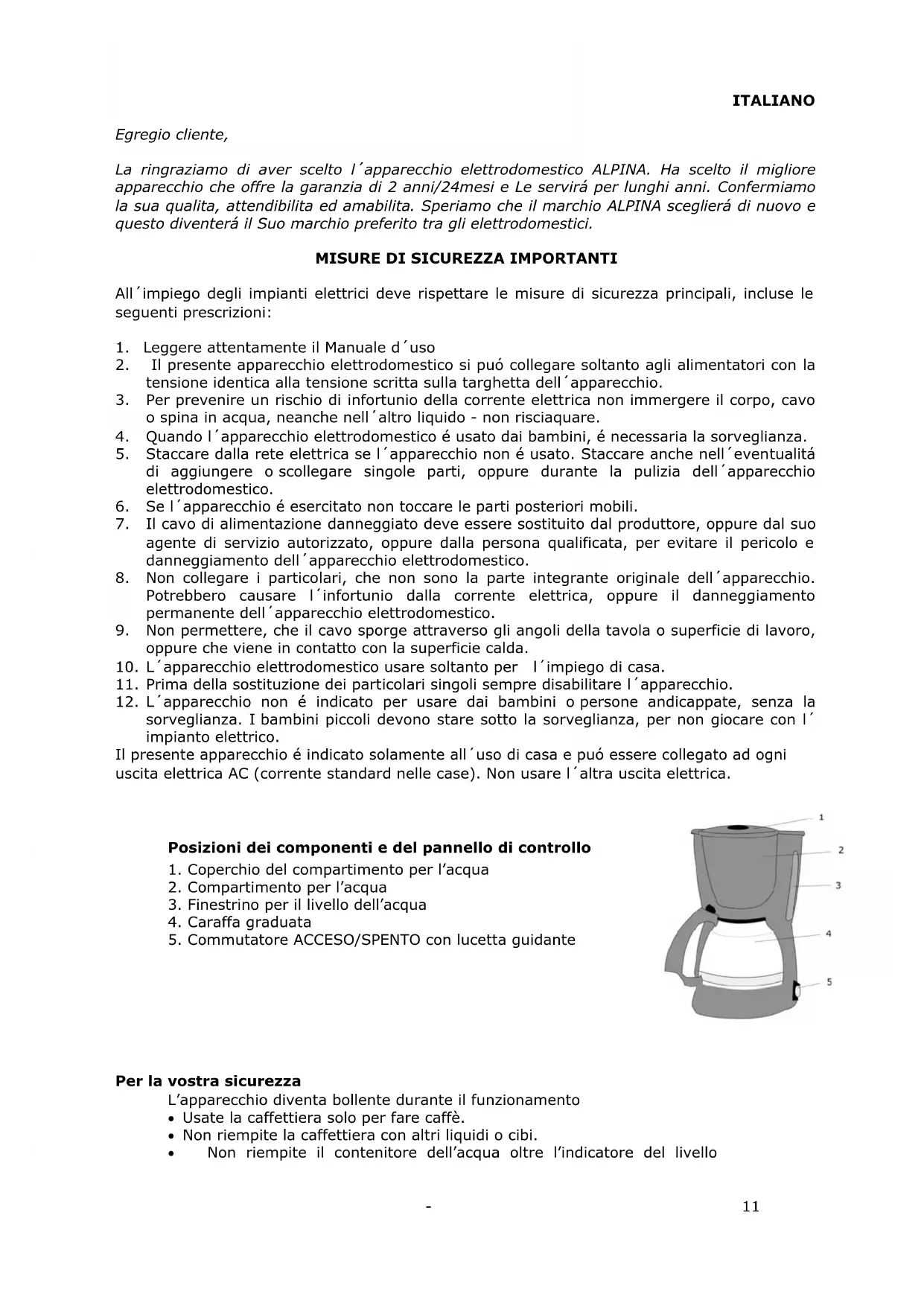 Egregio cliente, La ringraziamo di aver scelto l´apparecchio elettrodomestico ALPINA. Ha scelto il migliore apparecchio che offre la garanzia di 2 anni/24mesi e Le servirá per lunghi anni. Confermiamo la sua qualita, attendibilita ed amabilita. Speriamo che il marchio ALPINA sceglierá di nuovo e questo diventerá il Suo marchio preferito tra gli elettrodomestici.