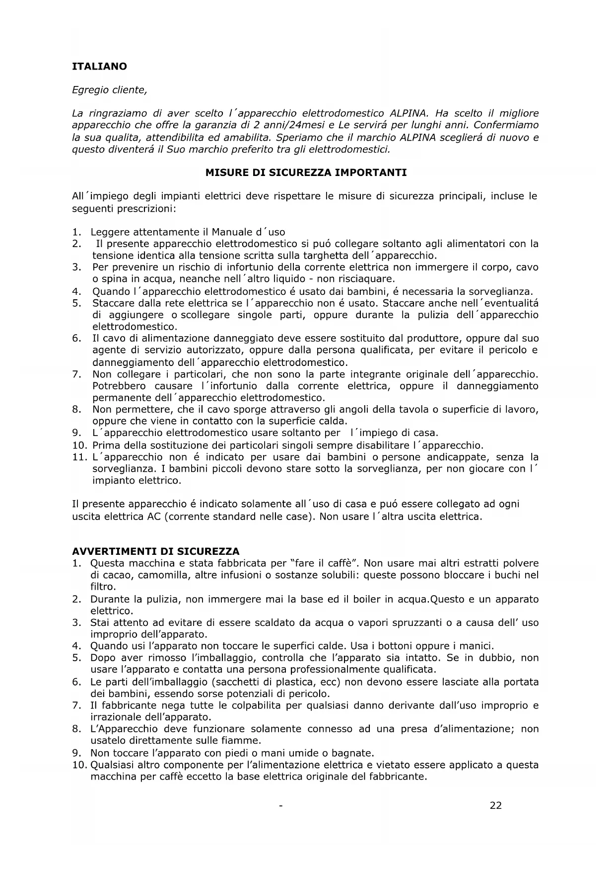 La ringraziamo di aver scelto l'apparecchio elettrodomestico ALPINA. Ha scelto il migliorere apparecchio che offre la garanzia di 2 anni/24mesi e Le servirá per lunghi anni. Confermiamo la sua qualita, attendibilità ed amabilità. Speriamo che il marchio ALPINA scegliera di nuovo e quello diventerà il Suo marchio preferito tra gli elettrodomestici.