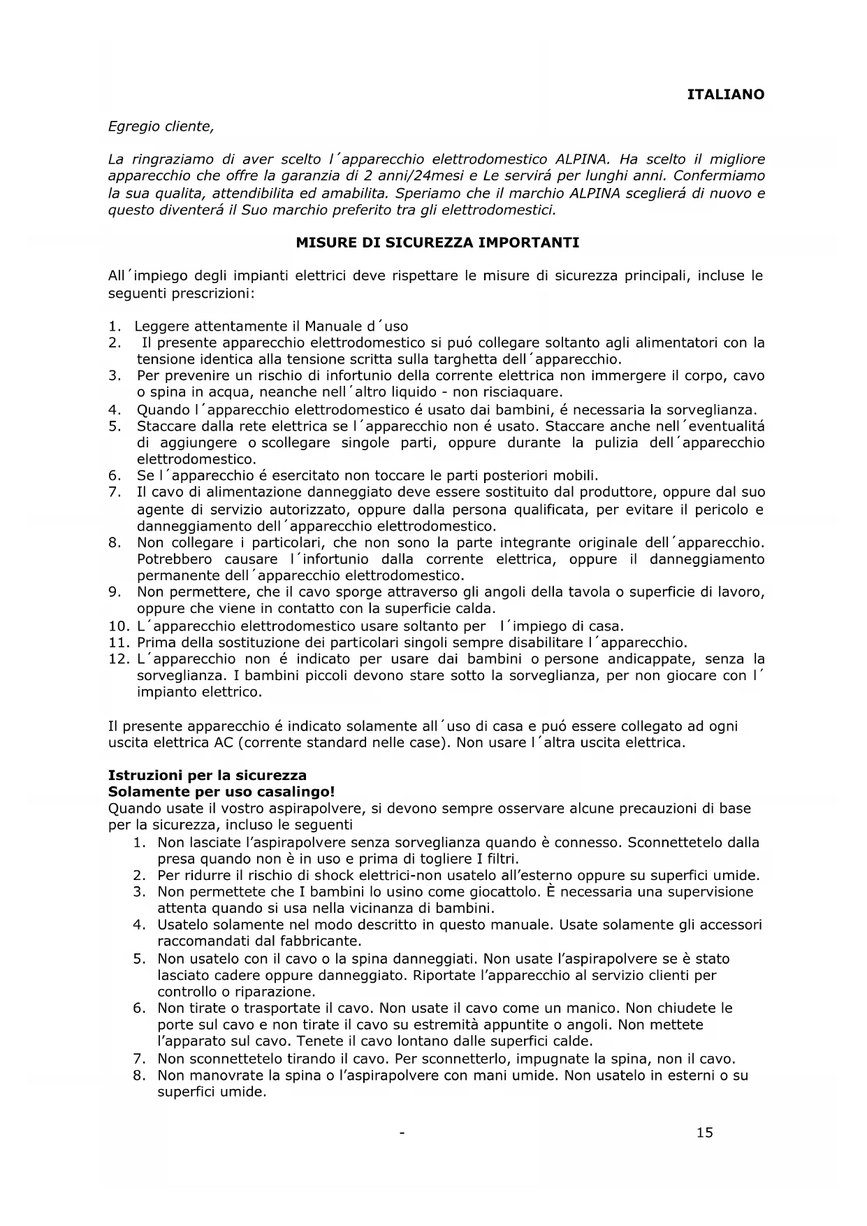 Egregio cliente, La ringraziamo di aver scelto l´apparecchio elettrodomestico ALPINA. Ha scelto il migliore apparecchio che offre la garanzia di 2 anni/24mesi e Le servirá per lunghi anni. Confermiamo la sua qualita, attendibilita ed amabilita. Speriamo che il marchio ALPINA sceglierá di nuovo e questo diventerá il Suo marchio preferito tra gli elettrodomestici.
