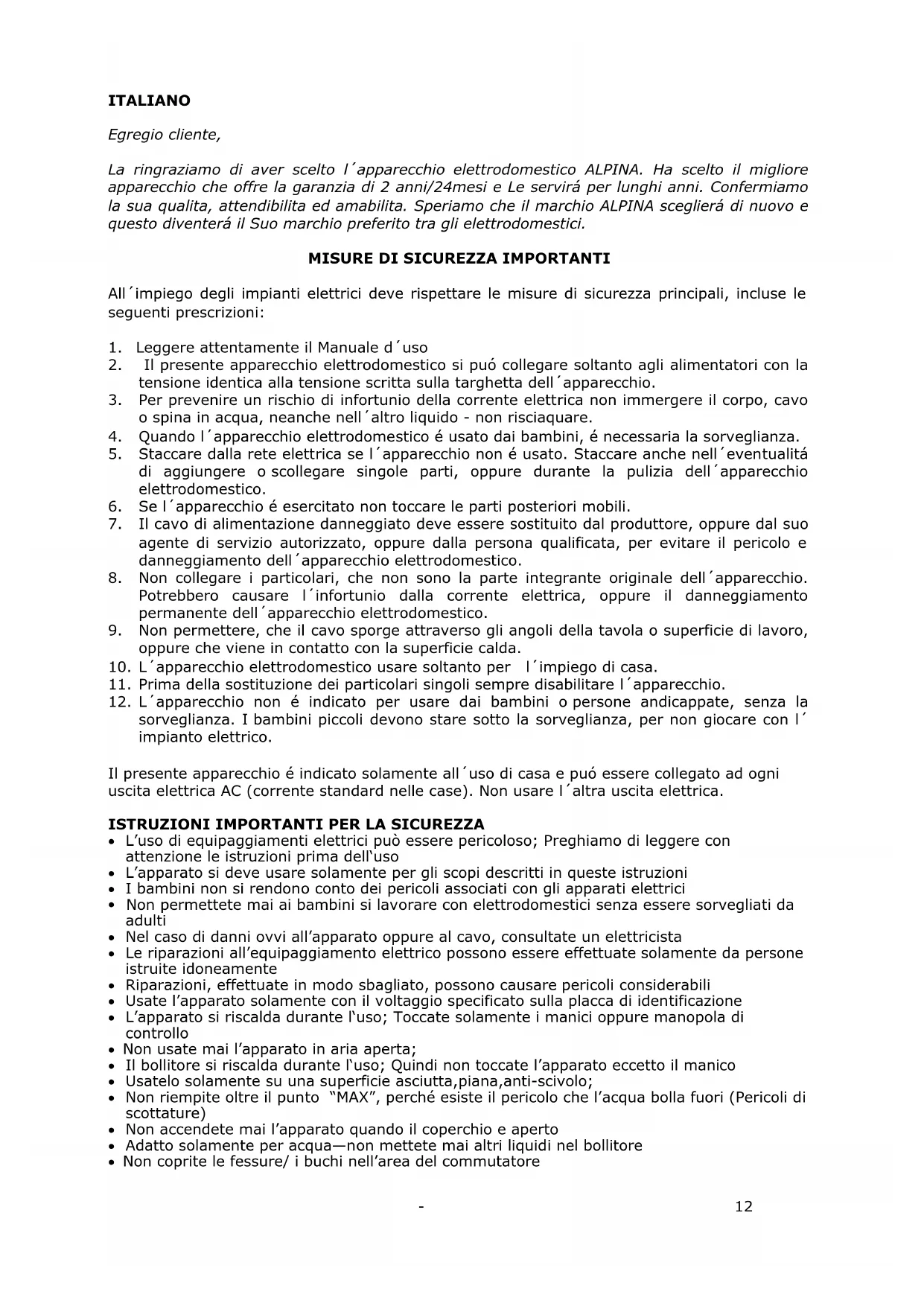 Egregio cliente, La ringraziamo di aver scelto l´apparecchio elettrodomestico ALPINA. Ha scelto il migliore apparecchio che offre la garanzia di 2 anni/24mesi e Le servirá per lunghi anni. Confermiamo la sua qualita, attendibilita ed amabilita. Speriamo che il marchio ALPINA sceglierá di nuovo e questo diventerá il Suo marchio preferito tra gli elettrodomestici.
