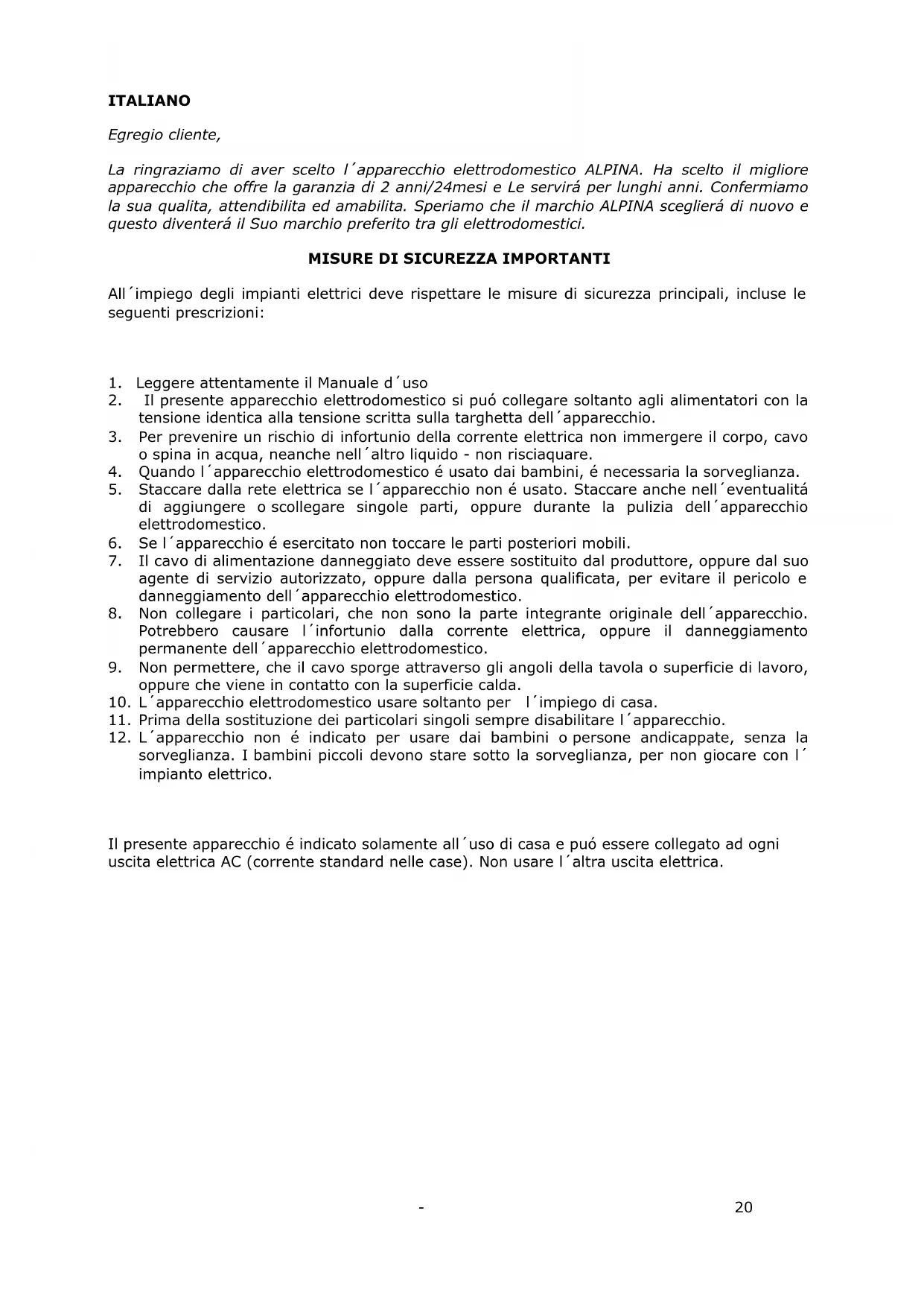 Egregio cliente, La ringraziamo di aver scelto l´apparecchio elettrodomestico ALPINA. Ha scelto il migliore apparecchio che offre la garanzia di 2 anni/24mesi e Le servirá per lunghi anni. Confermiamo la sua qualita, attendibilita ed amabilita. Speriamo che il marchio ALPINA sceglierá di nuovo e questo diventerá il Suo marchio preferito tra gli elettrodomestici.