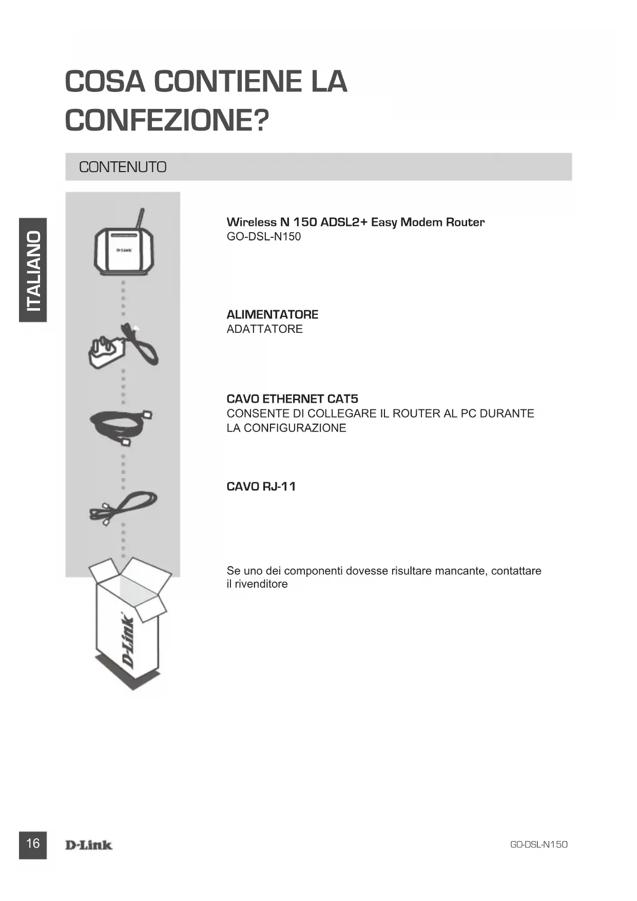 CONSENTE DI COLLEGARE IL ROUTER AL PC DURANTE LA CONFIGURAZIONE Se uno dei componenti dovesse risultare mancante, contattare il rivenditore