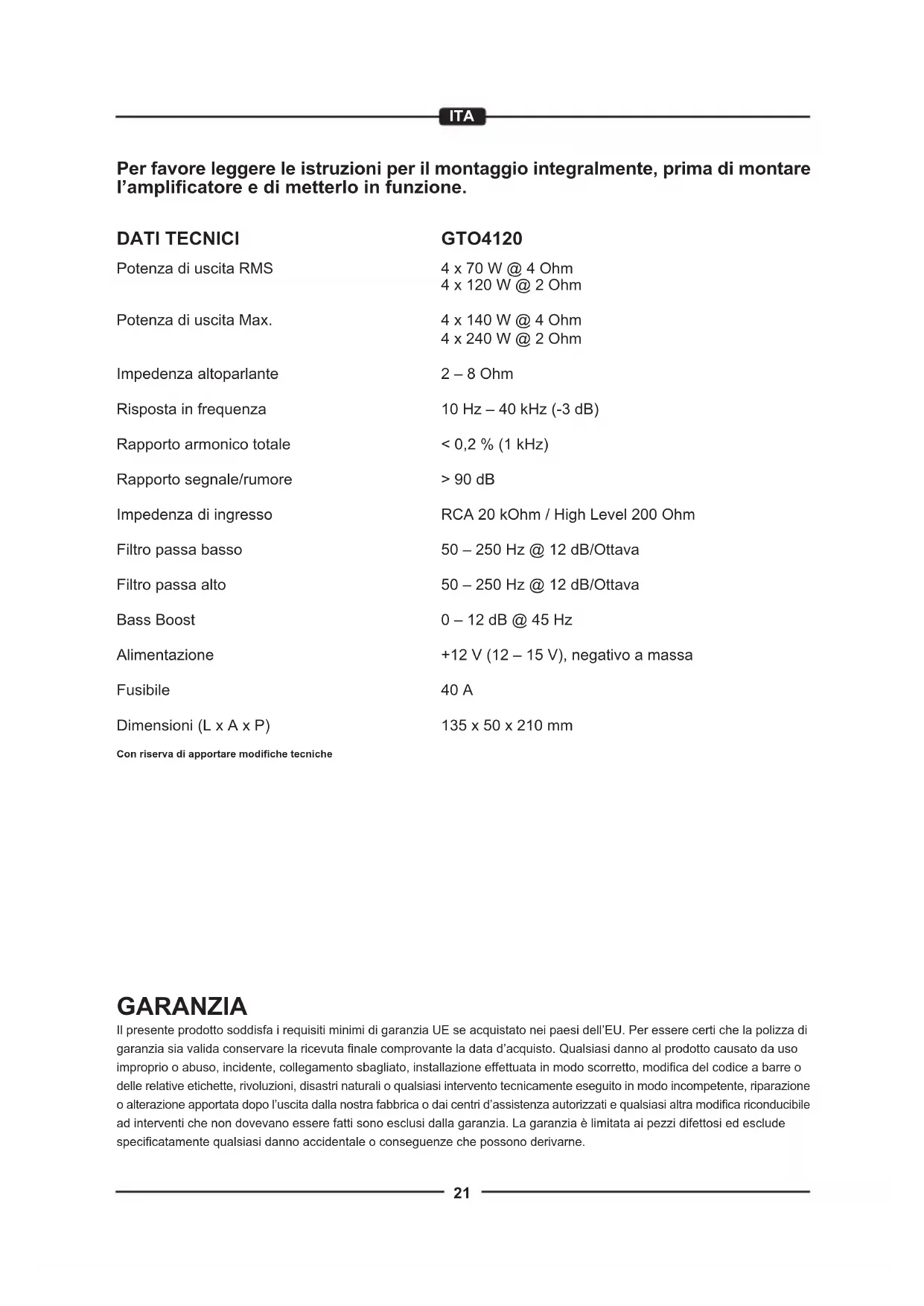Scarica le istruzioni per il tuo Ricevitore in formato PDF gratuitamente! Trova il tuo manuale GTO4120 - Crunch e riprendi in mano il tuo dispositivo elettronico. In questa pagina sono pubblicati tutti i documenti necessari per l'utilizzo del tuo dispositivo. GTO4120 del marchio Crunch.