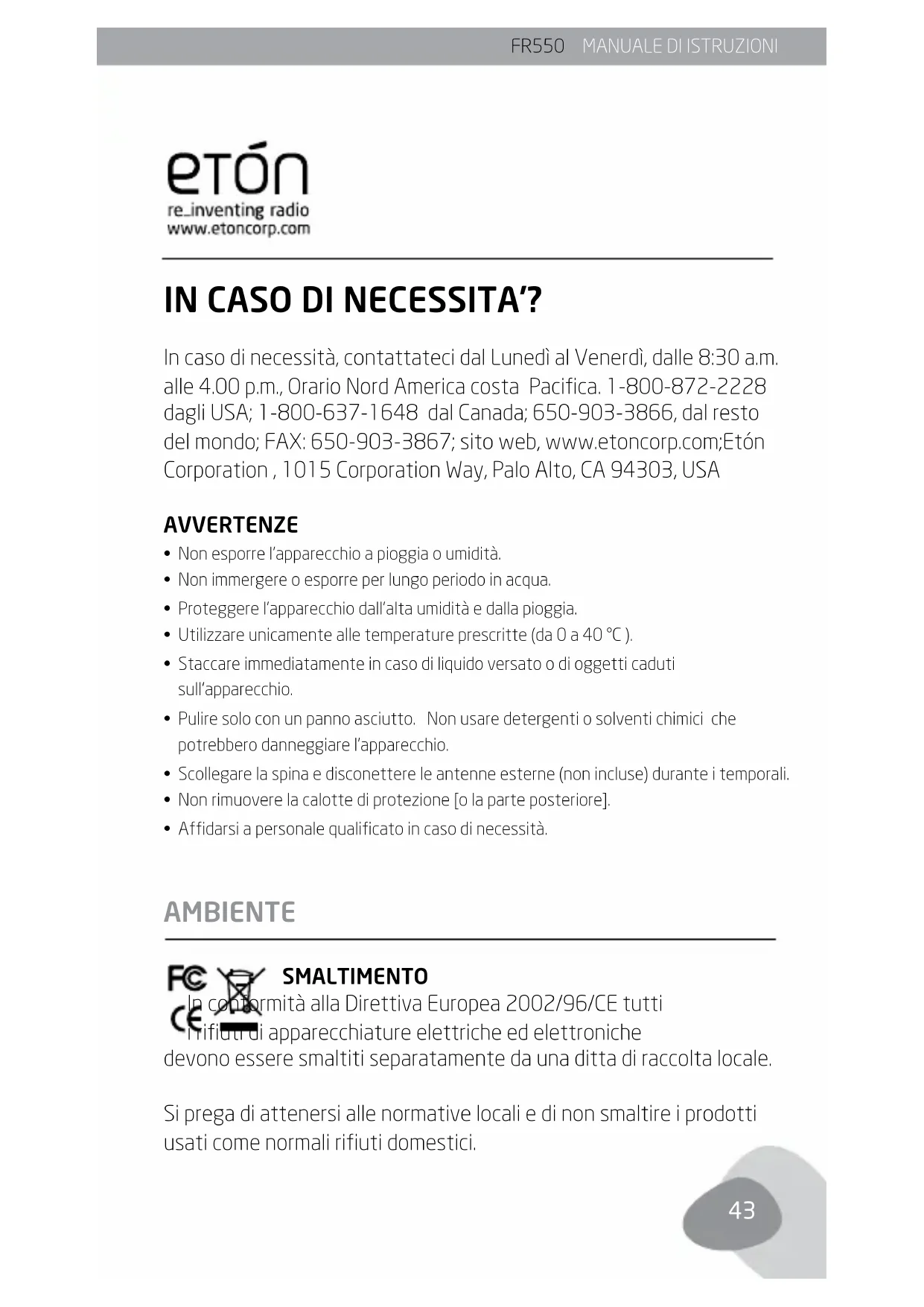rie all’indirizzo indicato sotto; indicare il nome, l’indirizzo completo, il numero di telefono, l’indirizzo e-mail, il modello acquistato, la data di acquisto, il nome del rivenditore: Etón Corporation 1015 Corporation Way Palo Alto, CA 94303 USAFR550 MANUALE DI ISTRUZIONI