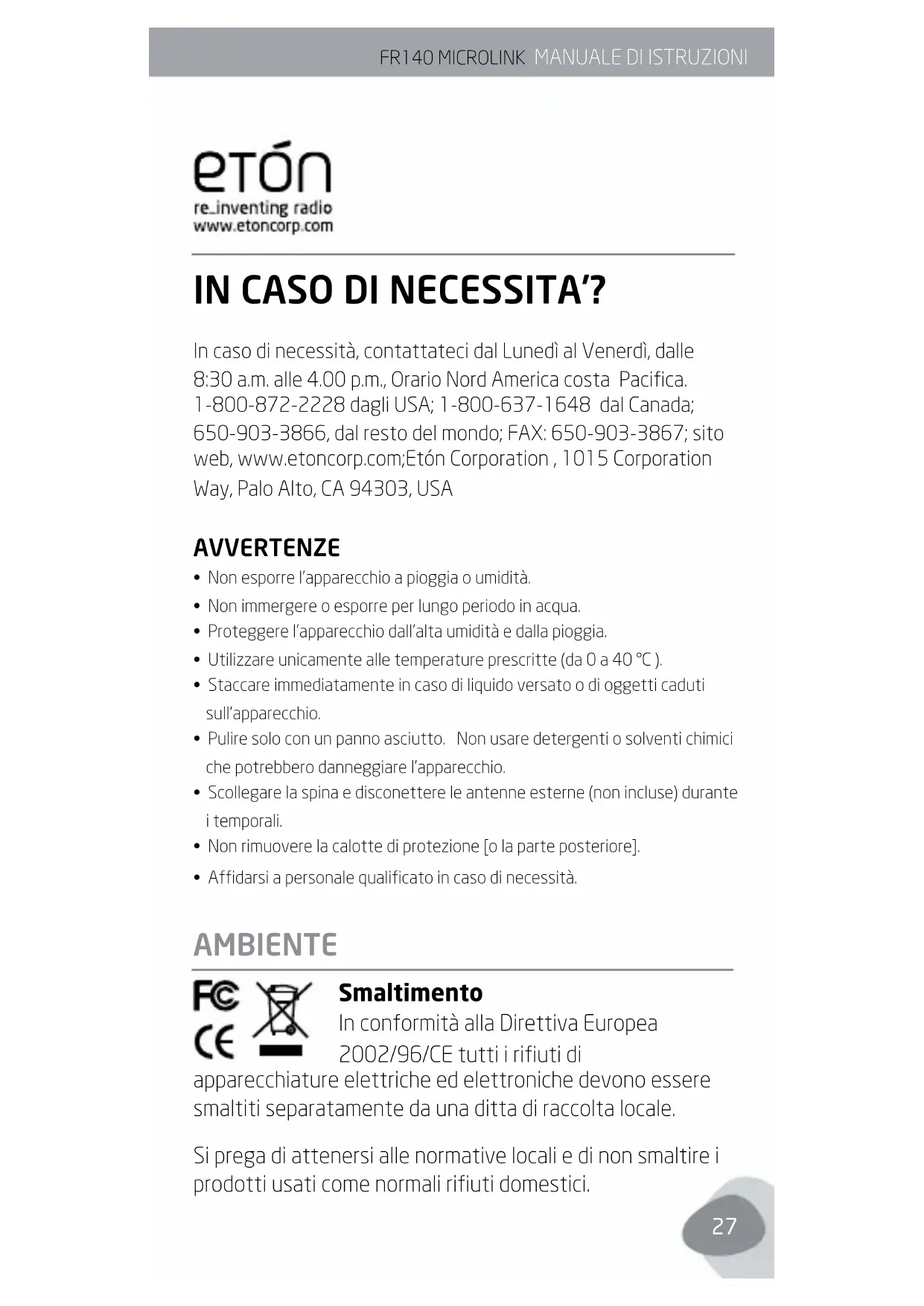 IN CASO DI NECESSITA’? In caso di necessità, contattateci dal Lunedì al Venerdì, dalle 8:30 a.m. alle 4.00 p.m., Orario Nord America costa Pacica. 1-800-872-2228 dagli USA; 1-800-637-1648 dal Canada; 650-903-3866, dal resto del mondo; FAX: 650-903-3867; sito web, www.etoncorp.com;Etón Corporation , 1015 Corporation Way, Palo Alto, CA 94303, USA AVVERTENZE