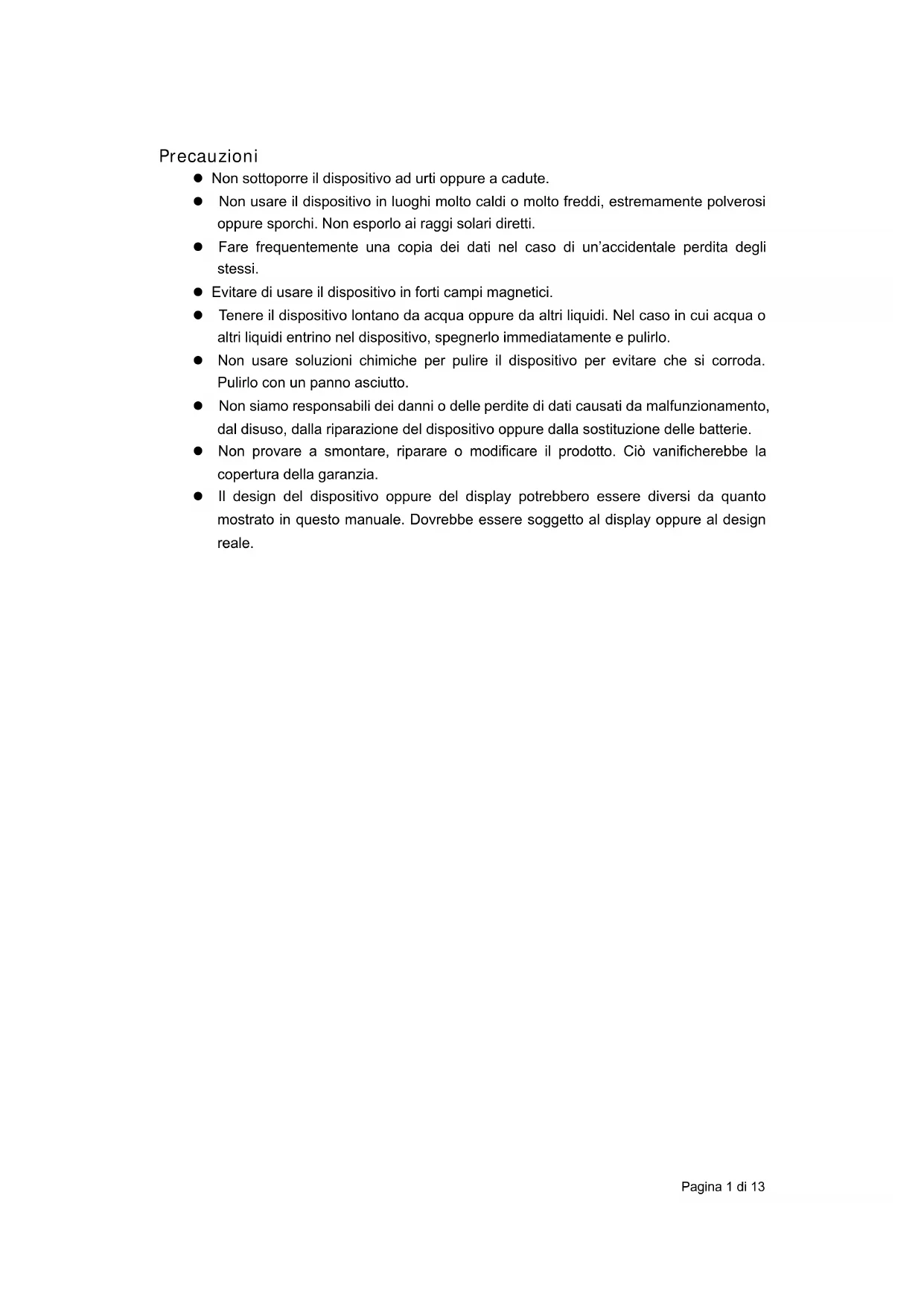 - Non siamo responsabili dei danni o delle perdite di dati causati da malfunzionamento, dal disuso, dalla riparazione del dispositivo oppure dalla sostituzione delle batterie.