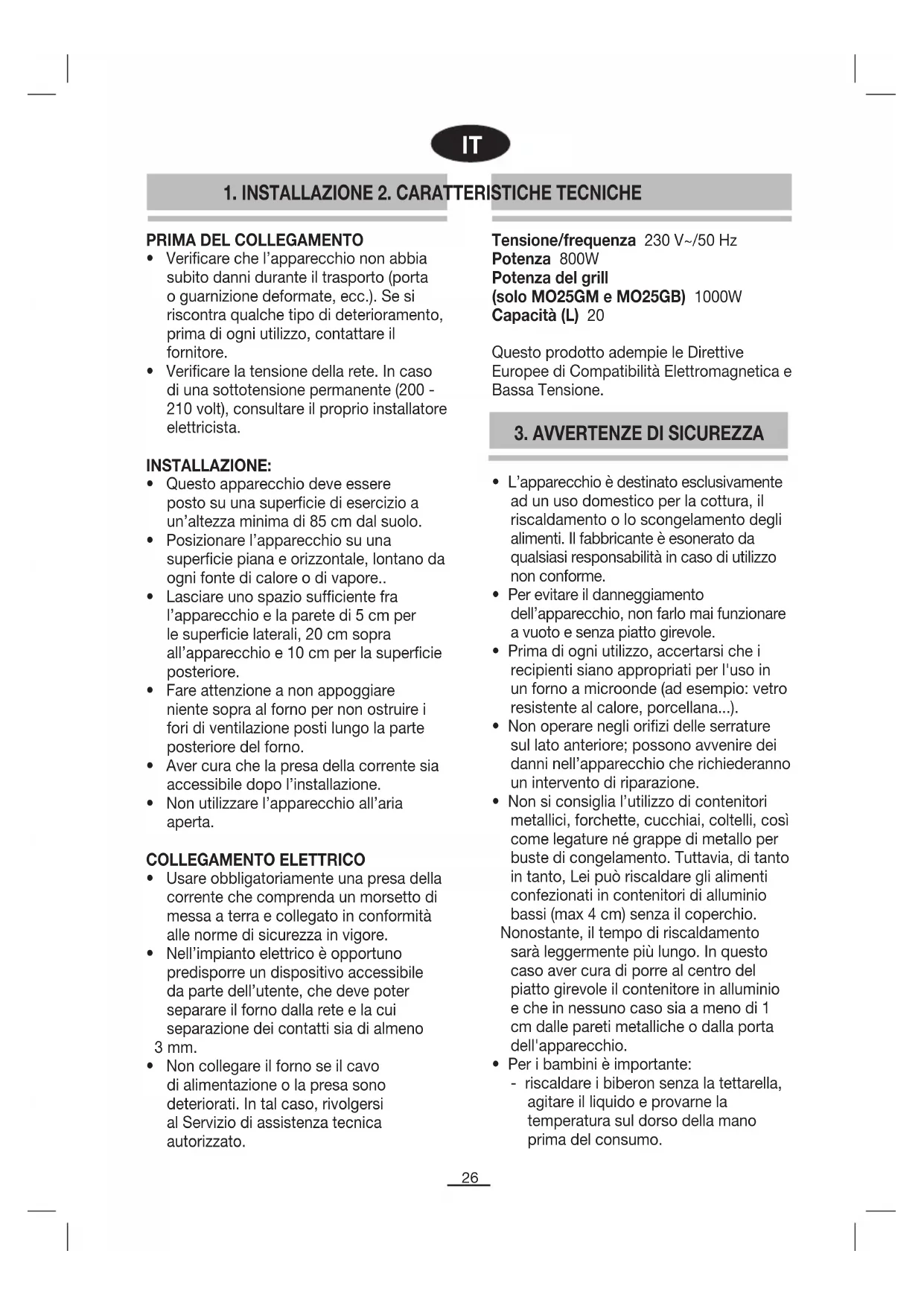 1. INSTALLAZIONE 2. CARATTERISTICHE TECNICHE Tensione/frequenza 230 V~/50 Hz