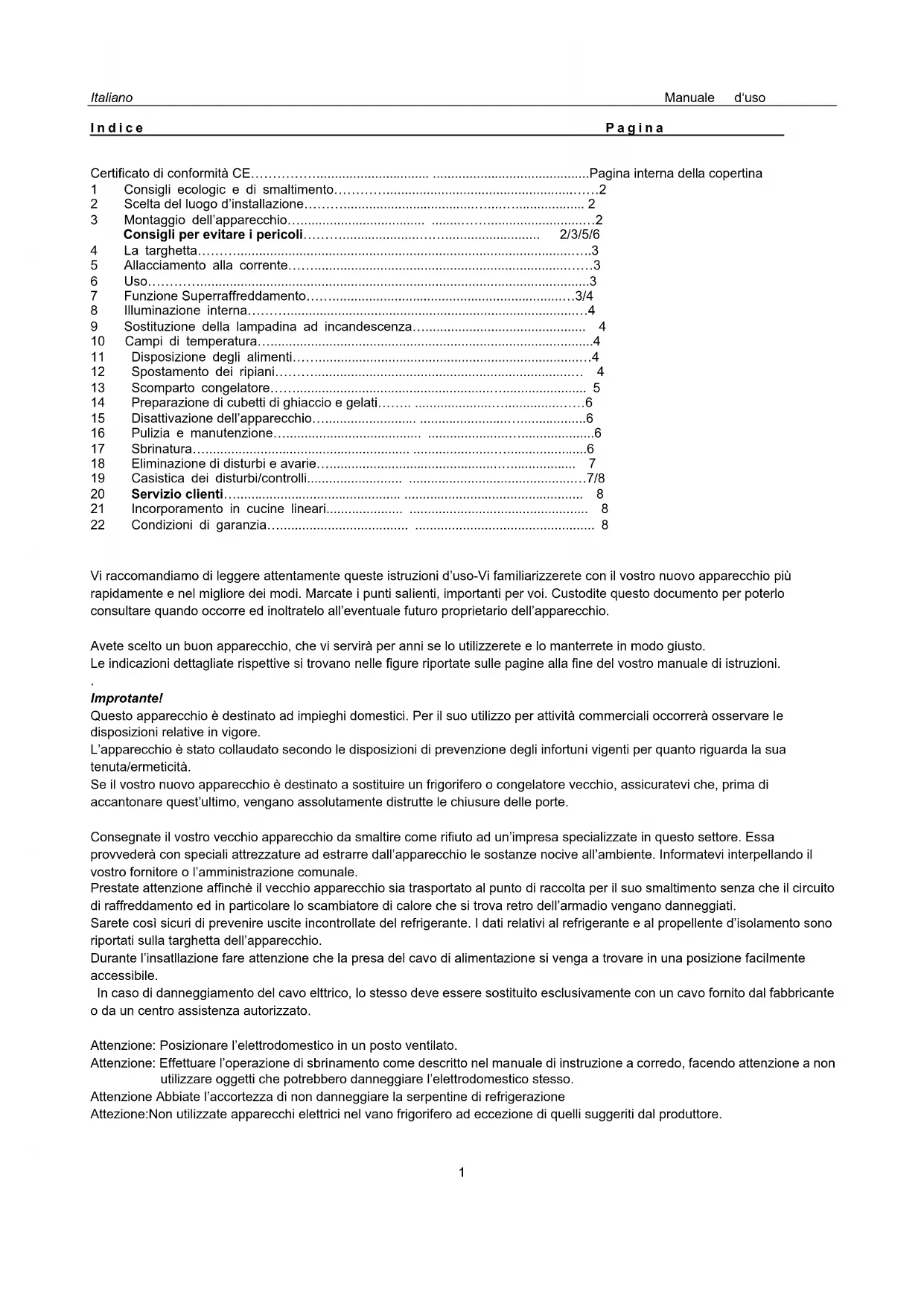 Attezione:Non utilizzate apparecchi elettrici nel vano frigorifero ad eccezione di quelli suggeriti dal produttore.Italiano Manuale d‘uso