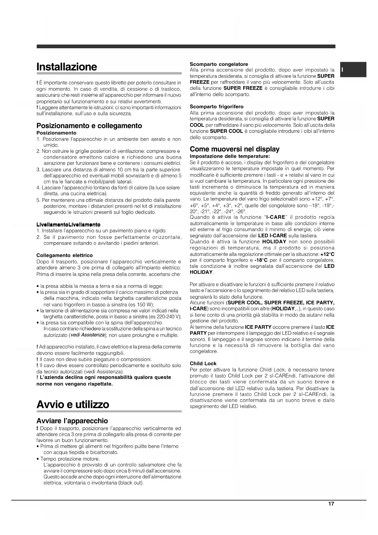 Leggere attentamente le istruzioni: ci sono importanti informazionisull’installazione, sull’uso e sulla sicurezza. Posizionamento e collegamento Posizionamento1. Posizionare l’apparecchio in un ambiente ben aerato e nonumido.2. Non ostruire le griglie posteriori di ventilazione: compressore econdensatore emettono calore e richiedono una buonaaerazione per funzionare bene e contenere i consumi elettrici.3. Lasciare una distanza di almeno 10 cm tra la parte superioredell’apparecchio ed eventuali mobili sovrastanti e di almeno 5cm tra le fiancate e mobili/pareti laterali.4. Lasciare l’apparecchio lontano da fonti di calore (la luce solarediretta, una cucina elettrica).5. Per mantenere una ottimale distanza del prodotto dalla pareteposteriore, montare i distanzieri presenti nel kit di installazioneseguendo le istruzioni presenti sul foglio dedicato.LivellamentoLivellamentoLivellamentoLivellamentoLivellamento1. Installare l’apparecchio su un pavimento piano e rigido.2. Se il pavimento non fosse perfettamente orizzontale,compensare svitando o avvitando i piedini anteriori.Collegamento elettricoDopo il trasporto, posizionare l’apparecchio verticalmente eattendere almeno 3 ore prima di collegarlo all’impianto elettrico.Prima di inserire la spina nella presa della corrente, accertarsi che:• la presa abbia la messa a terra e sia a norma di legge;• la presa sia in grado di sopportare il carico massimo di potenzadella macchina, indicato nella targhetta caratteristiche postanel vano frigorifero in basso a sinistra (es 150 W);• la tensione di alimentazione sia compresa nei valori indicati nellatarghetta caratteristiche, posta in basso a sinistra (es 220-240 V);• la presa sia compatibile con la spina dell’apparecchio.In caso contrario richiedere la sostituzione della spina a un tecnicoautorizzato ( vedi Assistenza ); non usare prolunghe e multiple.! Ad apparecchio installato, il cavo elettrico e la presa della correntedevono essere facilmente raggiungibili.! Il cavo non deve subire piegature o compressioni.! Il cavo deve essere controllato periodicamente e sostituito soloda tecnici autorizzati (vedi Assistenza).! L’azienda declina ogni responsabilità qualora questenorme non vengano rispettate. Avvio e utilizzo