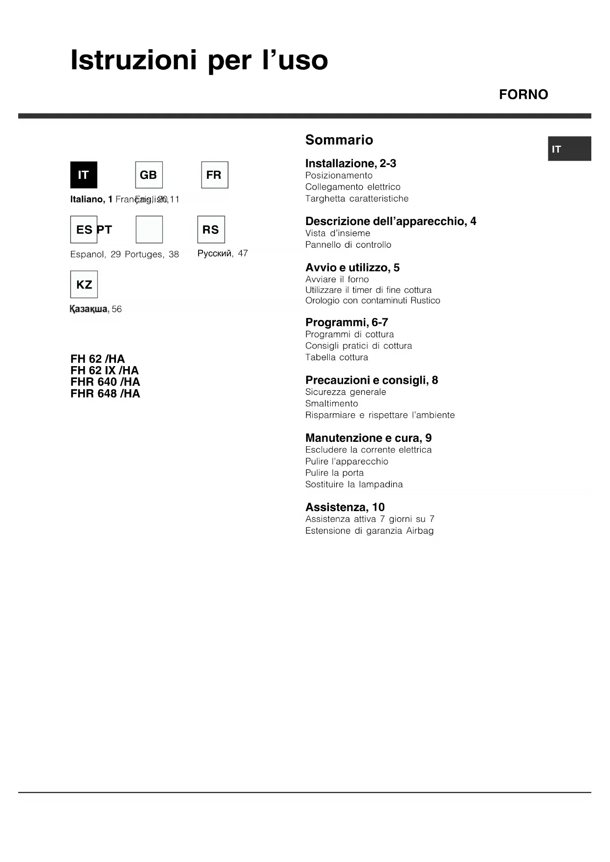 MANUALE UTENTE FH 62 (WH)HA HOTPOINT-ARISTON
