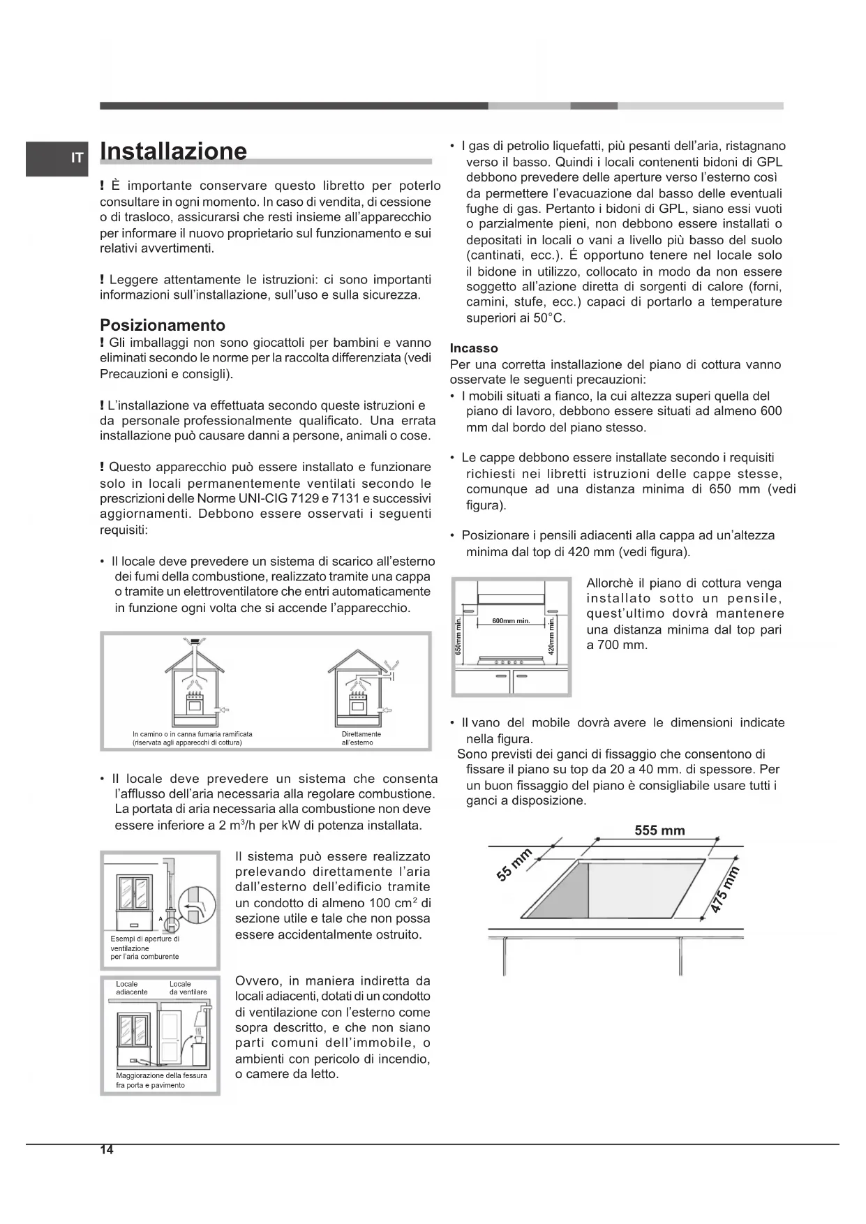 Installazione ! È importante conservare questo libretto per poterlo consultare in ogni momento. In caso di vendita, di cessione o di trasloco, assicurarsi che resti insieme all’apparecchio per informare il nuovo proprietario sul funzionamento e sui relativi avvertimenti. ! Leggere attentamente le istruzioni: ci sono importanti informazioni sull’installazione, sull’uso e sulla sicurezza. Posizionamento ! Gli imballaggi non sono giocattoli per bambini e vanno eliminati secondo le norme per la raccolta differenziata (vedi Precauzioni e consigli). ! L’installazione va effettuata secondo queste istruzioni e da personale professionalmente qualicato. Una errata installazione può causare danni a persone, animali o cose. ! Questo apparecchio può essere installato e funzionare solo in locali permanentemente ventilati secondo le prescrizioni delle Norme UNI-CIG 7129 e 7131 e successivi aggiornamenti. Debbono essere osservati i seguenti requisiti: