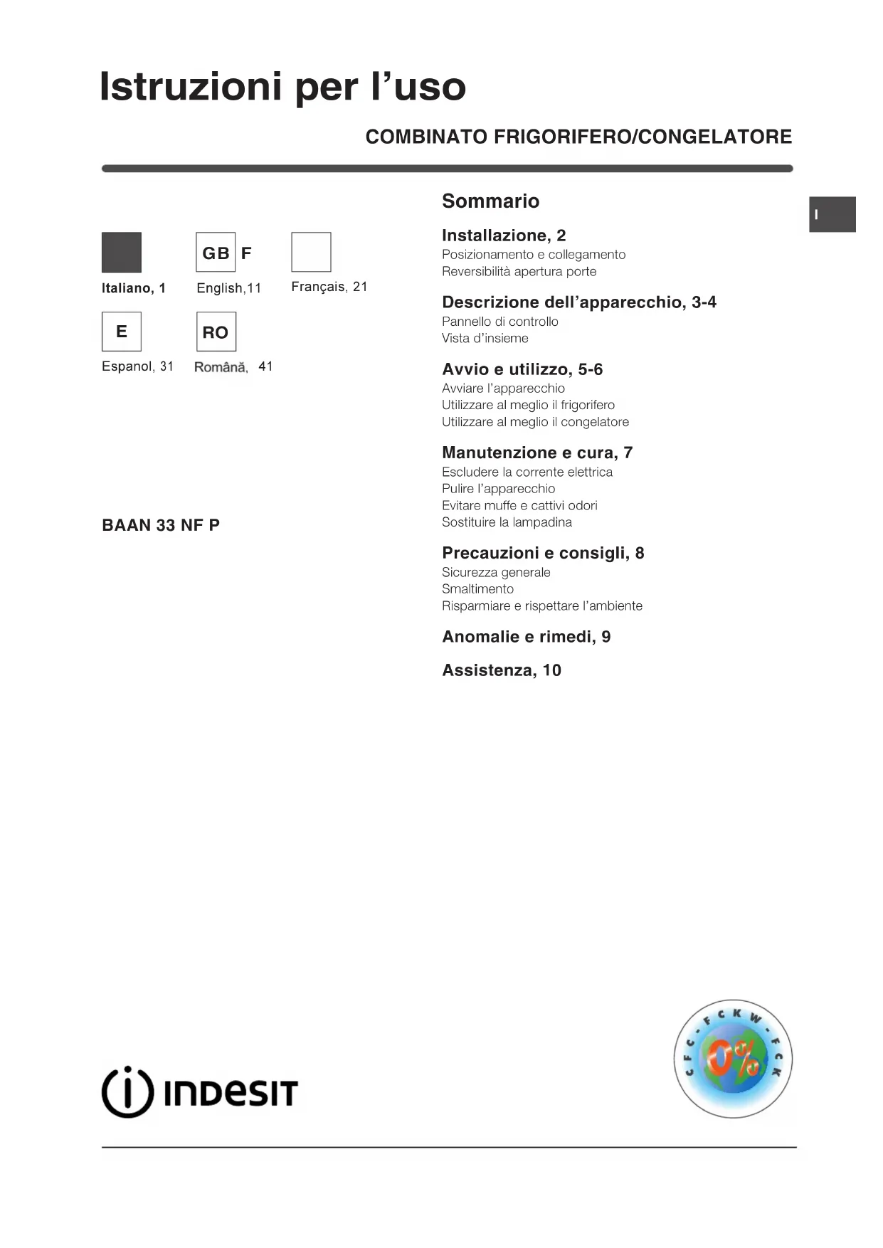 Scarica le istruzioni per il tuo Frigorifero in formato PDF gratuitamente! Trova il tuo manuale BAAN 33 NF S - INDESIT e riprendi in mano il tuo dispositivo elettronico. In questa pagina sono pubblicati tutti i documenti necessari per l'utilizzo del tuo dispositivo. BAAN 33 NF S del marchio INDESIT.
