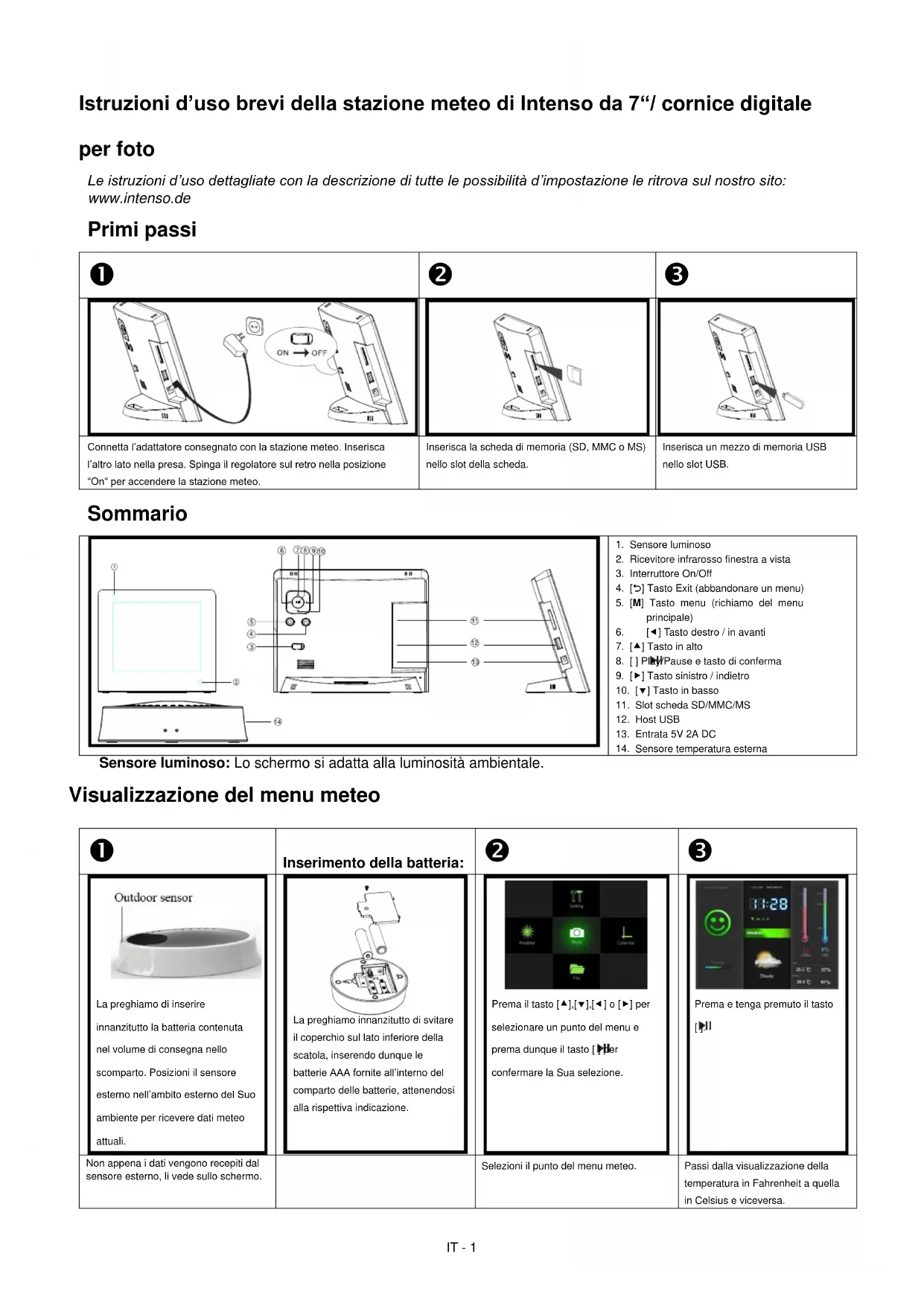 Cura Per evitare il pericolo di scosse elettriche, La preghiamo di non eliminare le vite e la scatola. Non utilizzi questo apparecchio vicino all’acqua. Non esponga questo apparecchio a pioggia e umidità. Non metta oggetti vicin o all’apparecchio che assorbono acqua o altri liquidi. Non installi questa cornice per foto vicino a termosifoni, forni o altri apparecchi che trasmettono calore. Non apra la scatola. Non cerchi di riparare l’apparecchio. Faccia eseguire la riparazione da un esperto. Eviti l’uso in luoghi sabbiosi. La preghiamo di inserire la presa di collegamento dell’adattatore completamente all’interno dell’apertura della stazione meteo di Intenso. Solo in questo modo riesce a evitare una carica elettrostatica. Colleghi tutti i collegamenti in modo corretto e sicuro. La preghiamo di non premere sullo schermo. Protegga lo schermo dall’insolazione intensa. La cornice da foto riproduce solo formati di file compatibili. Le immagini possono essere protette da diritti di terzi. La riproduzione senza licenza potrebbe violare i diritti d’autore. La preghiamo di non toccare la stazione meteo di Intenso con oggetti metallici durante il funzionamento. La preghiamo di evitare l’uso di cuscini, sofà e altri oggetti di arredamento che sostengono la formazione di calore visto ch e sussiste il pericolo che l’oggetto si surriscaldi. La preghiamo di non estrarre le schede di memoria durante il procedimenti di lettura. Altrimenti il sistema potrebbe interrom persi causando la perdita di dati. La preghiamo di non interrompere l’apparecchiatura durante una proiezione di diapositive. La preghiamo di non imballare direttamente l’apparecchiatura dopo un lungo periodo di non uso. Predisponga un raffreddamento sufficiente. Altrimenti sussiste il pericolo di surriscaldamento. Per garantire un servizio migliore, le istruzioni d’uso possono subire delle modifiche.