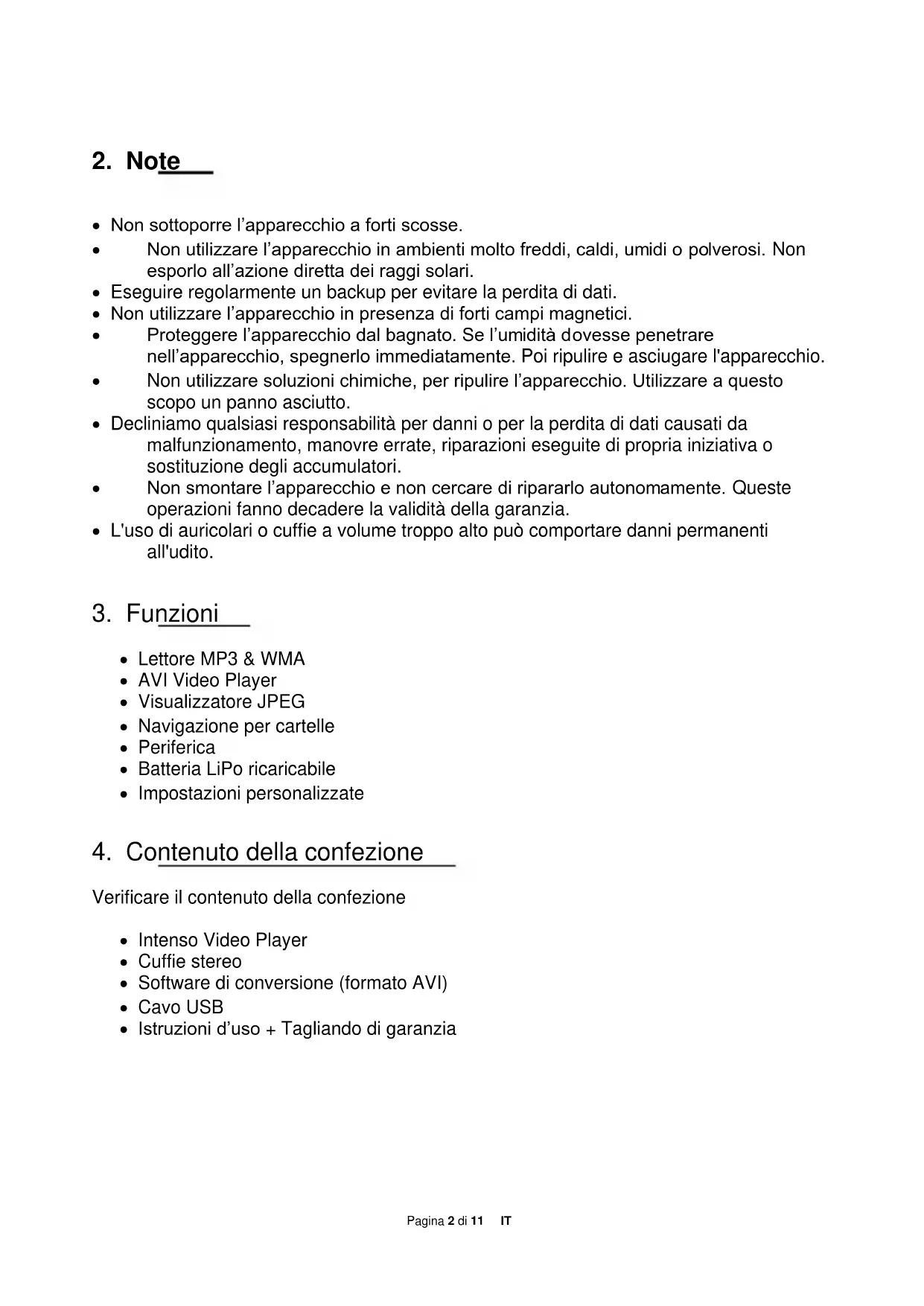 Verificare il contenuto della confezione Intenso Video Player Cuffie stereo Software di conversione (formato AVI) Cavo USB Istruzioni d’uso + Tagliando di garanziaPagina 3 di 11 IT