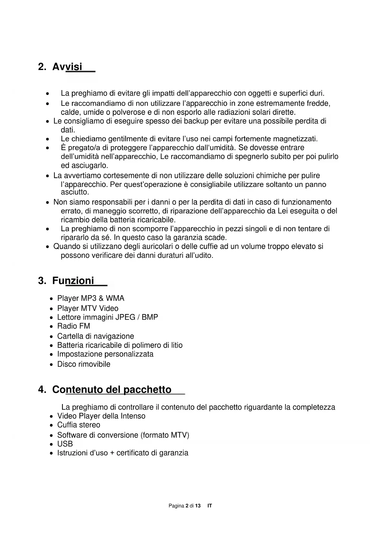 La preghiamo di controllare il contenuto del pacchetto riguardante la completezza Video Player della Intenso Cuffia stereo Software di conversione (formato MTV) USB Istruzioni d‟uso + certificato di garanziaPagina 3 di 13 IT