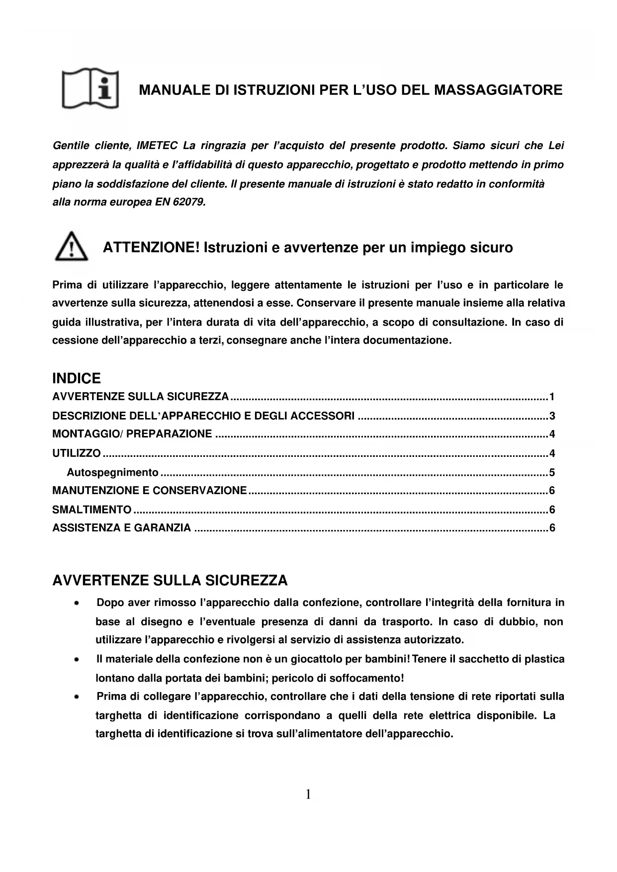 MANUALE DI ISTRUZIONI PER L’USO DEL MASSAGGIATORE Gentile cliente, IMETEC La ringrazia per l’acquisto del presente prodotto. Siamo sicuri che Lei