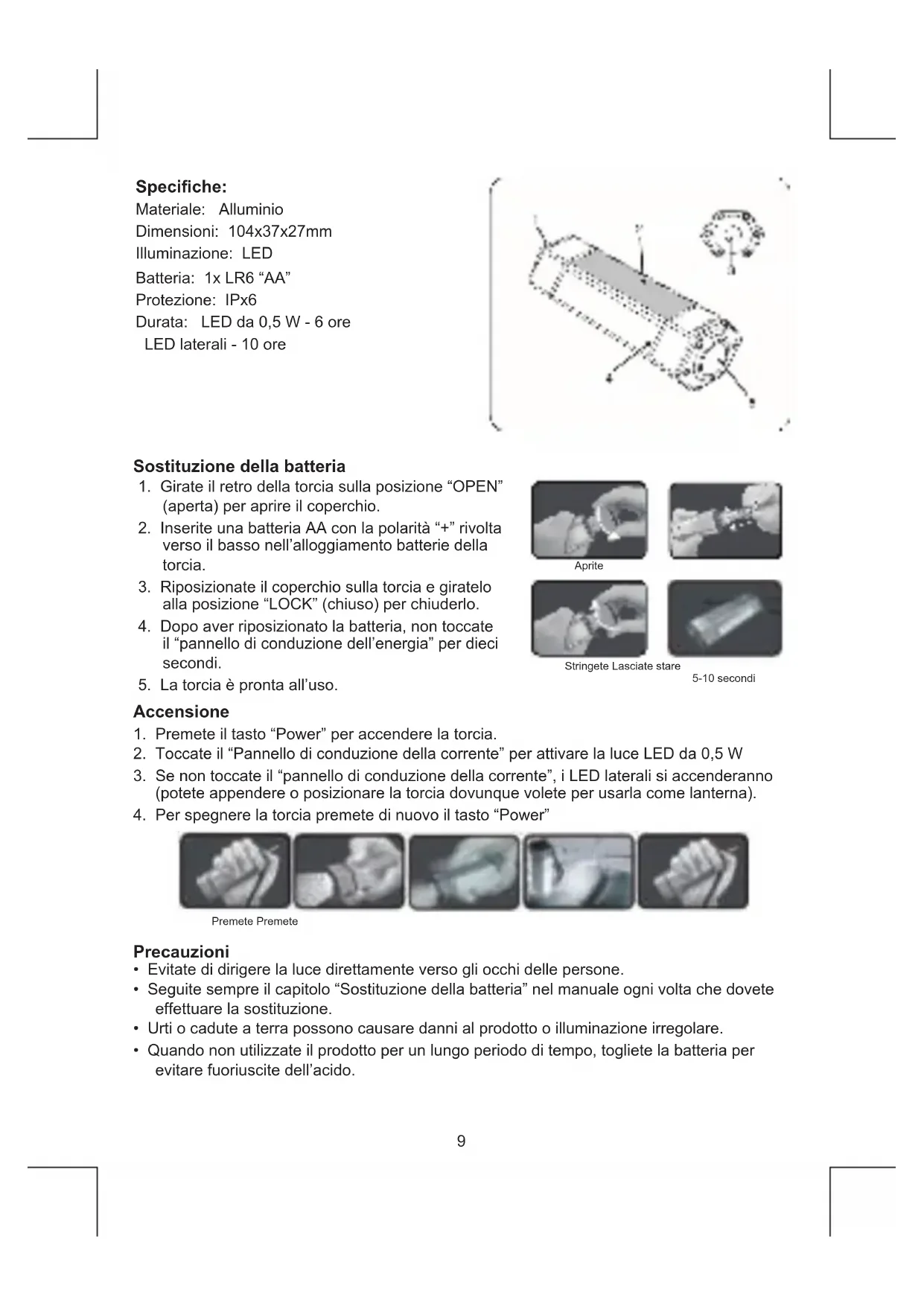 GEVAAR VOOR ELEKTRISCHE SCHOK NIET OPENEN LET OP:9 Speciche: Materiale: Alluminio Dimensioni: 104x37x27mm Illuminazione: LED Batteria: 1x LR6 “AA” Protezione: IPx6 Durata: LED da 0,5 W - 6 ore LED laterali - 10 ore Sostituzione della batteria