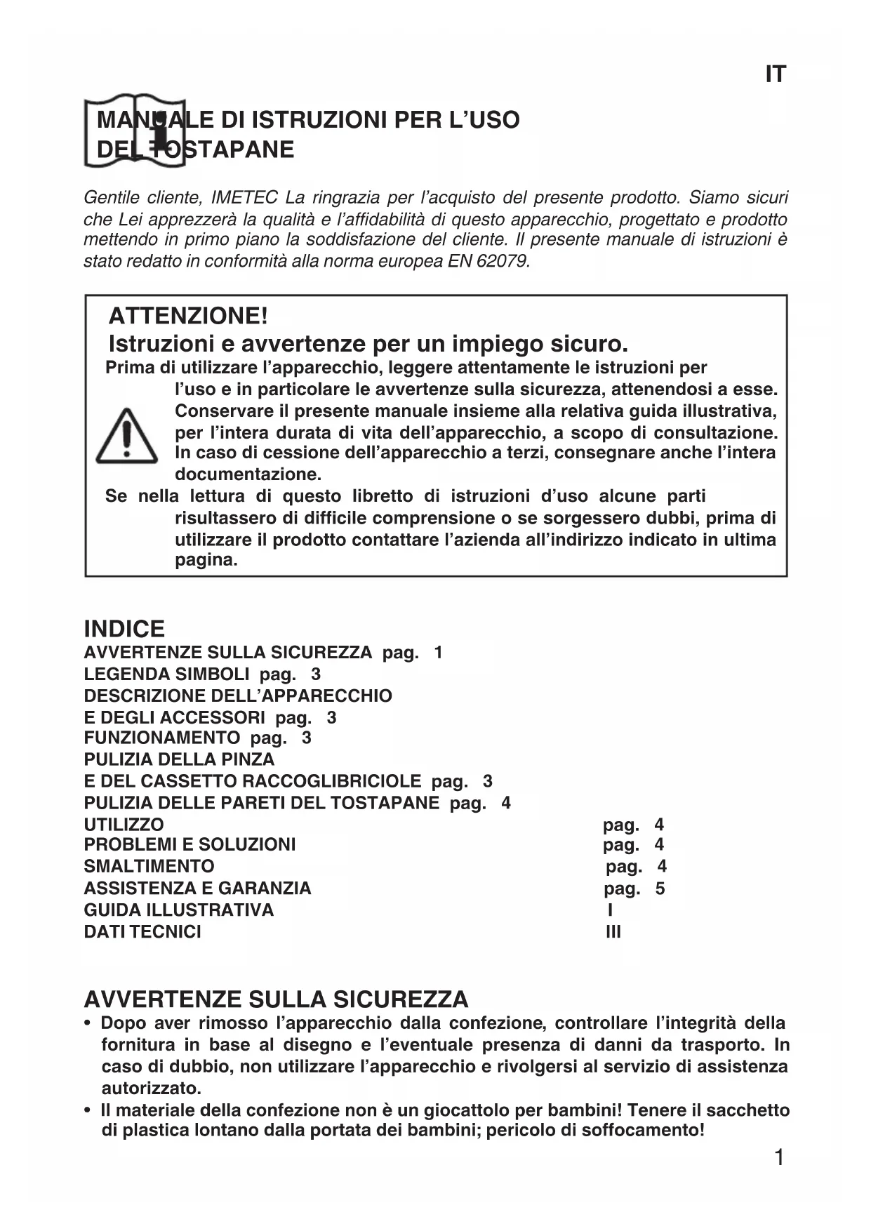 220-240 V 50 Hz 750 WIT MANUALE DI ISTRUZIONI PER L’USO DEL TOSTAPANE Gentile cliente, IMETEC La ringrazia per l’acquisto del presente prodotto. Siamo sicuri