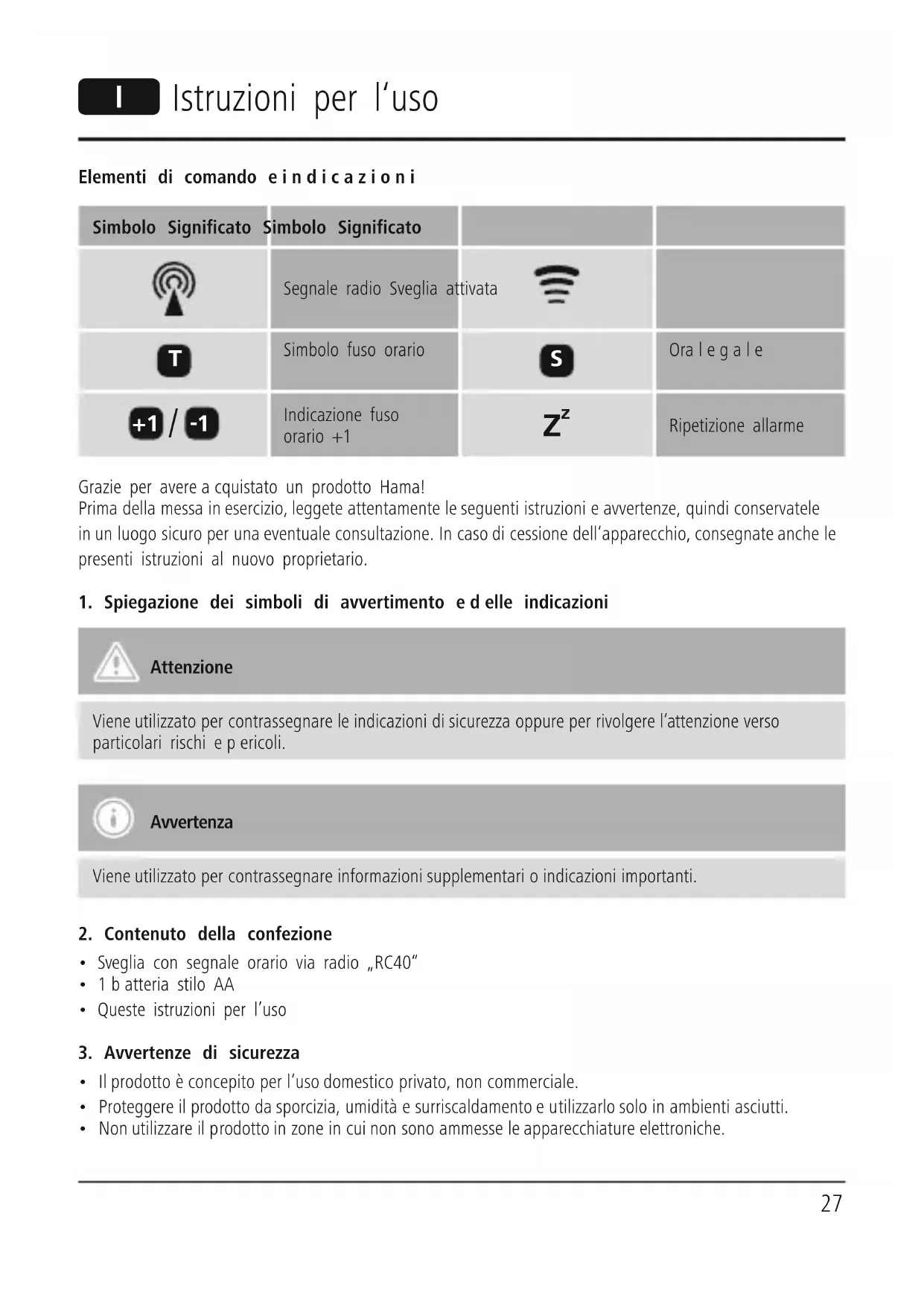 in un luogo sicuroper una eventuale consultazione. In caso di cessione dell‘apparecchio, consegnate anche le presenti istruzioni al nuovo proprietario.1. Spiegazione dei simboli di avvertimento edelle indicazioniAttenzione Viene utilizzato per contrassegnareleindicazioni di sicurezza oppureper rivolgerel‘attenzione verso particolari rischi epericoli.Avvertenza Viene utilizzato per contrassegnareinformazioni supplementari oindicazioni importanti. 2. Contenuto della confezione• Sveglia con segnale orario via radio „RC40“• 1batteria stilo AA• Queste istruzioni per l’uso3. Avvertenze di sicurezza • Il prodotto èconcepito per l’uso domestico privato, non commerciale.