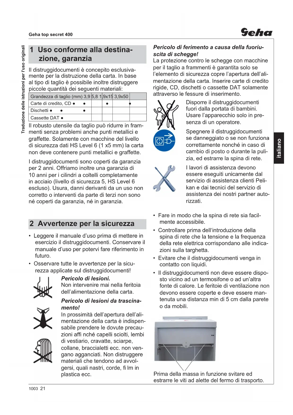 - EN 60950-1:20061003 21 Geha top secret 400 italiano Prima della massa in funzione svitare ed estrarre le viti ad alette del fermo di trasporto. Il distruggidocumenti è concepito esclusiva- mente per la distruzione della carta. In base al tipo di taglio è possibile inoltre distruggere piccole quantità dei seguenti materiali: Grandezza di taglio (mm) 3,9 5,8 1,9x15 3,9x50 Carte di credito, CD ●● ● ● Dischetti ●● ● Cassette DAT ● Il robusto utensile da taglio può ridurre in fram- menti senza problemi anche punti metallici e graffette. Solamente con macchine del livello di sicurezza dati HS Level 6 (1 x5 mm) la carta non deve contenere punti metallici e graffette. I distruggidocumenti sono coperti da garanzia per 2 anni. Offriamo inoltre una garanzia di 10 anni per i cilindri a coltelli completamente in acciaio (livello di sicurezza 5, HS Level 6 escluso). Usura, danni derivanti da un uso non corretto o interventi da parte di terzi non sono né coperti da garanzia, né in garanzia. 1 Uso conforme alla destina- zione, garanzia Pericolo di ferimento a causa della fuoriu- scita di schegge! La protezione contro le schegge con macchine per il taglio a frammenti è garantita solo se l’elemento di sicurezza copre l’apertura dell’ali- mentazione della carta. Inserire carte di credito rigide, CD, dischetti o cassette DAT solamente attraverso le fessure di inserimento. Disporre il distruggidocumenti fuori dalla portata di bambini. Usare l’apparecchio solo in pre- senza di un operatore. Spegnere il distruggidocumenti se danneggiato o se non funziona correttamente nonché in caso di cambio di posto o durante la puli- zia, ed estrarre la spina di rete. I lavori di assistenza devono essere eseguiti unicamente dal servizio di assistenza clienti Peli- kan e dai tecnici del servizio di assistenza dei nostri partner auto- rizzati.