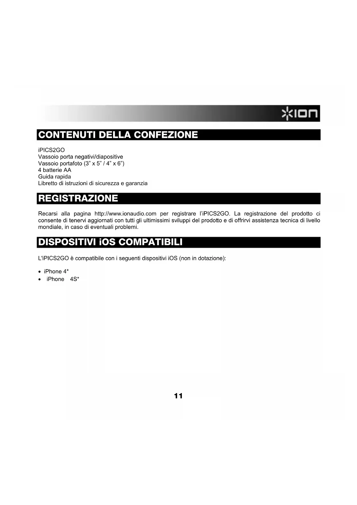 iPICS2GO Vassoio porta negativi/diapositive Vassoio portafoto (3” x 5” / 4” x 6”) 4 batterie AA Guida rapida Libretto di istruzioni di sicurezza e garanzia REGISTRAZIONE Recarsi alla pagina http://www.ionaudio.com per registrare l’iPICS2GO. La registrazione del prodotto ci consente di tenervi aggiornati con tutti gli ultimissimi sviluppi del prodotto e di offrirvi assistenza tecnica di livello mondiale, in caso di eventuali problemi. DISPOSITIVI iOS COMPATIBILI L'iPICS2GO è compatibile con i seguenti dispositivi iOS (non in dotazione):