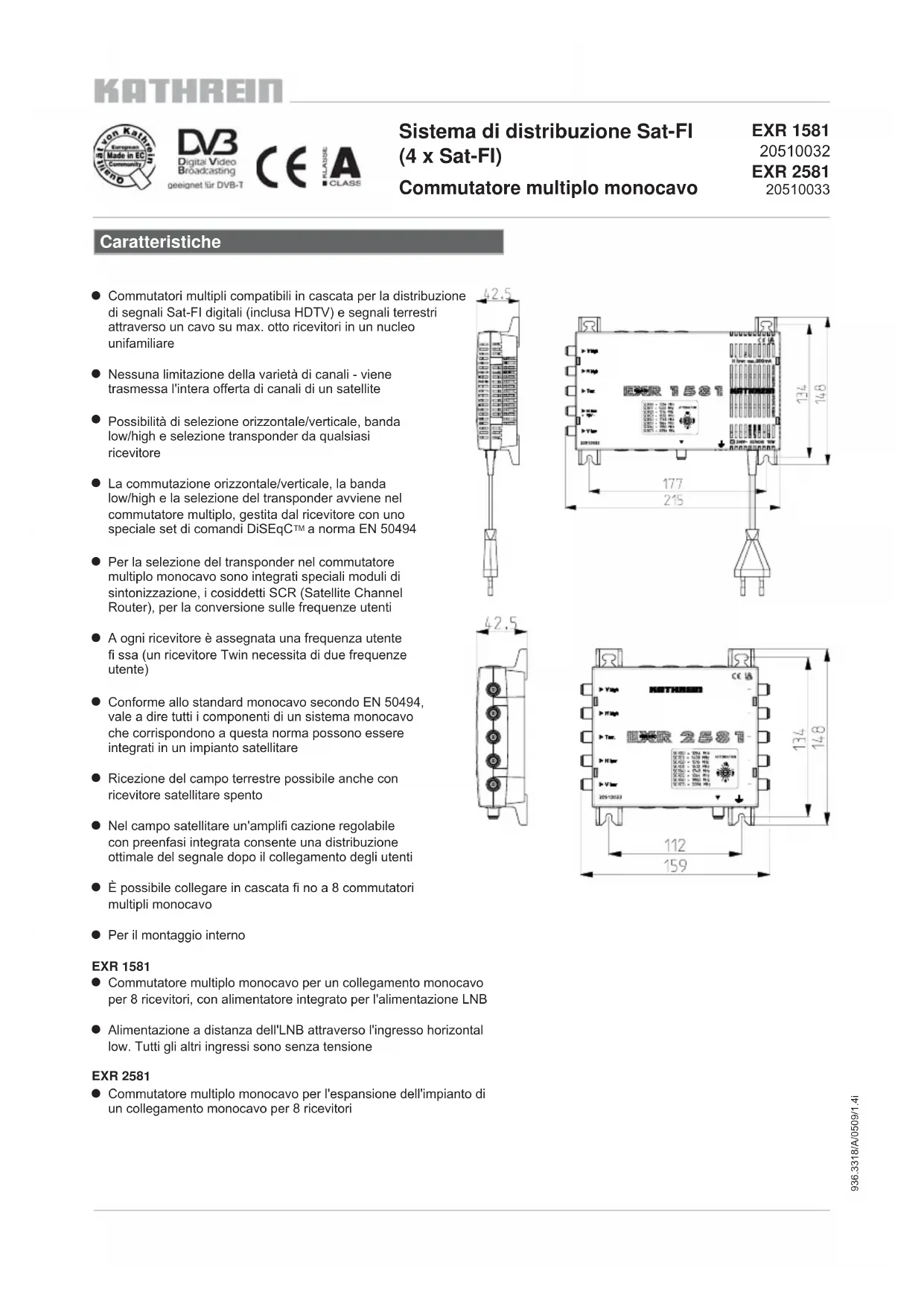 Commutatori multipli compatibili in cascata per la distribuzionedi segnali Sat-FI digitali (inclusa HDTV) e segnali terrestri attraverso un cavo su max. otto ricevitori in un nucleo unifamiliare Nessuna limitazione della varietà di canali - viene trasmessa l'intera offerta di canali di un satellite Possibilità di selezione orizzontale/verticale, banda low/high e selezione transponder da qualsiasi ricevitore La commutazione orizzontale/verticale, la banda low/high e la selezione del transponder avviene nel commutatore multiplo, gestita dal ricevitore con uno speciale set di comandi DiSEqC a norma EN 50494 Per la selezione del transponder nel commutatore multiplo monocavo sono integrati speciali moduli di sintonizzazione, i cosiddetti SCR (Satellite Channel Router), per la conversione sulle frequenze utenti A ogni ricevitore è assegnata una frequenza utente fi ssa (un ricevitore Twin necessita di due frequenze utente) Conforme allo standard monocavo secondo EN 50494, vale a dire tutti i componenti di un sistema monocavo che corrispondono a questa norma possono essere integrati in un impianto satellitare Ricezione del campo terrestre possibile anche con ricevitore satellitare spento Nel campo satellitare un'amplifi cazione regolabile con preenfasi integrata consente una distribuzione ottimale del segnale dopo il collegamento degli utenti È possibile collegare in cascata fi no a 8 commutatori multipli monocavo Per il montaggio internoEXR 1581 Commutatore multiplo monocavo per un collegamento monocavo per 8 ricevitori, con alimentatore integrato per l'alimentazione LNB Alimentazione a distanza dell'LNB attraverso l'ingresso horizontal low. Tutti gli altri ingressi sono senza tensioneEXR 2581 Commutatore multiplo monocavo per l'espansione dell'impianto di un collegamento monocavo per 8 ricevitori936.3318/A/0509/1.4i936.3318/A/0509/2.4i Tipo EXR 1581 EXR 2581 Codice n. 20510032 20510033 Collegamenti utenti 1 x 8 1 x 8 Ingressi 1 x terrestre 4 x Sat-FI 1 x terrestre 4 x Sat-FI Campo di frequenza MHz 5-862 950-2150 5-862 950-2150 Attenuazione passante dB - - 2,5 2,0 Attenuazione di collegamento (terrestre) dB 1-7- Amplifi cazione sul collegamento utente (SAT)