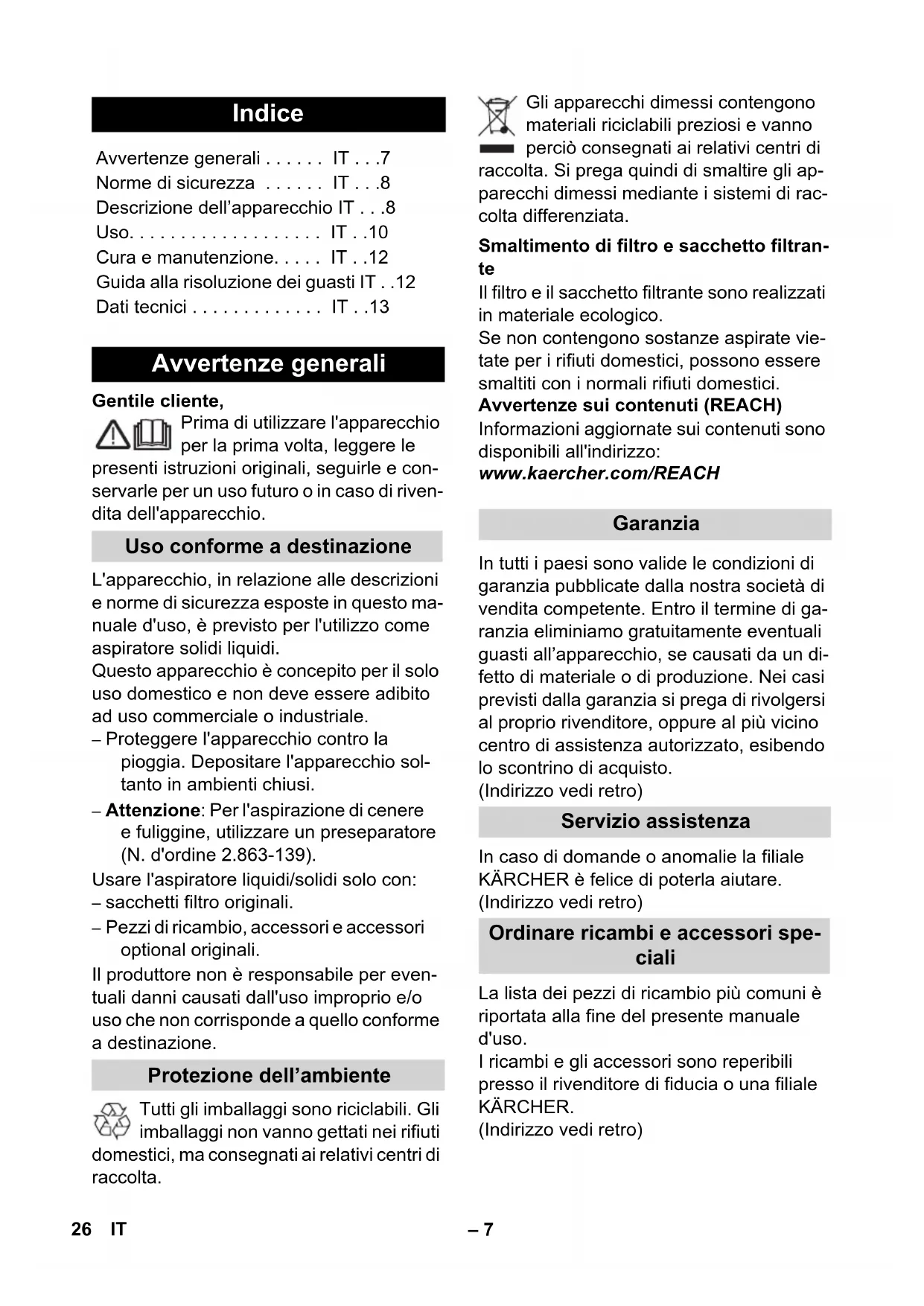 • J 1 24 FR– 13 Si la puissance d'aspiration baisse, veuillez vérifier les points suivants : Accessoires, tuyaux ou tubes d'aspira- tion colmatés, éliminer le colmatage. le filtre à plis plats est encrassé : Pour les appareils sans nettoyage du filtre ExPress : déposer et nettoyer le filtre à plis plats (voir le chapitre « Nettoyage du filtre à plis plats »). Pour les appareils avec nettoyage de filtre ExPress : actionner 3 fois la touche de nettoyage du filtre, le cas échéant, répéter le nettoyage avec le flexible d'aspiration fermé (voir le cha- pitre « Nettoyage du filtre à plis plats »). Si nécessaire, nettoyer le filtre à l'eau courante. Remplacer le filtre à plis plats endom- magé. Le sac filtrant est plein : Mettre un nou- veau sac filtrant en place (référence, voir la nomenclature de pièces de re- change à la fin de ce manuel). 몇 Attention Ne pas jeter le logement du sac filtrant ! Les caractéristiques techniques se trouvent sur les pages dépliantes. Ci-après l'explication des symboles qui y sont utili- sés. Sous réserve de modifications techniques ! Faible puissance d'aspiration Caractéristiques techniques Tension Puissance P nom Puissance P max Puissance de raccordement max. de la prise Protection du réseau (à action retardée) Volume de la cuve Arrivée d'eau avec poignée Arrivée d'eau avec buse de sol Câble d’alimentation Niveau de pression acoustique (EN 60704-2-1) Poids (sans accessoire) 25FR– 7 Gentile cliente, Prima di utilizzare l'apparecchio per la prima volta, leggere le presenti istruzioni originali, seguirle e con- servarle per un uso futuro o in caso di riven- dita dell'apparecchio. L'apparecchio, in relazione alle descrizioni e norme di sicurezza esposte in questo ma- nuale d'uso, è previsto per l'utilizzo come aspiratore solidi liquidi. Questo apparecchio è concepito per il solo uso domestico e non deve essere adibito ad uso commerciale o industriale. – Proteggere l'apparecchio contro la pioggia. Depositare l'apparecchio sol- tanto in ambienti chiusi. – Attenzione: Per l'aspirazione di cenere e fuliggine, utilizzare un preseparatore (N. d'ordine 2.863-139). Usare l'aspiratore liquidi/solidi solo con: – sacchetti filtro originali. – Pezzi di ricambio, accessori e accessori optional originali. Il produttore non è responsabile per even- tuali danni causati dall'uso improprio e/o uso che non corrisponde a quello conforme a destinazione. Tutti gli imballaggi sono riciclabili. Gli imballaggi non vanno gettati nei rifiuti domestici, ma consegnati ai relativi centri di raccolta. Gli apparecchi dimessi contengono materiali riciclabili preziosi e vanno perciò consegnati ai relativi centri di raccolta. Si prega quindi di smaltire gli ap- parecchi dimessi mediante i sistemi di rac- colta differenziata. Il filtro e il sacchetto filtrante sono realizzati in materiale ecologico. Se non contengono sostanze aspirate vie- tate per i rifiuti domestici, possono essere smaltiti con i normali rifiuti domestici. Avvertenze sui contenuti (REACH) Informazioni aggiornate sui contenuti sono disponibili all'indirizzo: www.kaercher.com/REACH In tutti i paesi sono valide le condizioni di garanzia pubblicate dalla nostra società di vendita competente. Entro il termine di ga- ranzia eliminiamo gratuitamente eventuali guasti all’apparecchio, se causati da un di- fetto di materiale o di produzione. Nei casi previsti dalla garanzia si prega di rivolgersi al proprio rivenditore, oppure al più vicino centro di assistenza autorizzato, esibendo lo scontrino di acquisto. (Indirizzo vedi retro) In caso di domande o anomalie la filiale KÄRCHER è felice di poterla aiutare. (Indirizzo vedi retro) La lista dei pezzi di ricambio più comuni è riportata alla fine del presente manuale d'uso. I ricambi e gli accessori sono reperibili presso il rivenditore di fiducia o una filiale KÄRCHER. (Indirizzo vedi retro) Indice Avvertenze generali