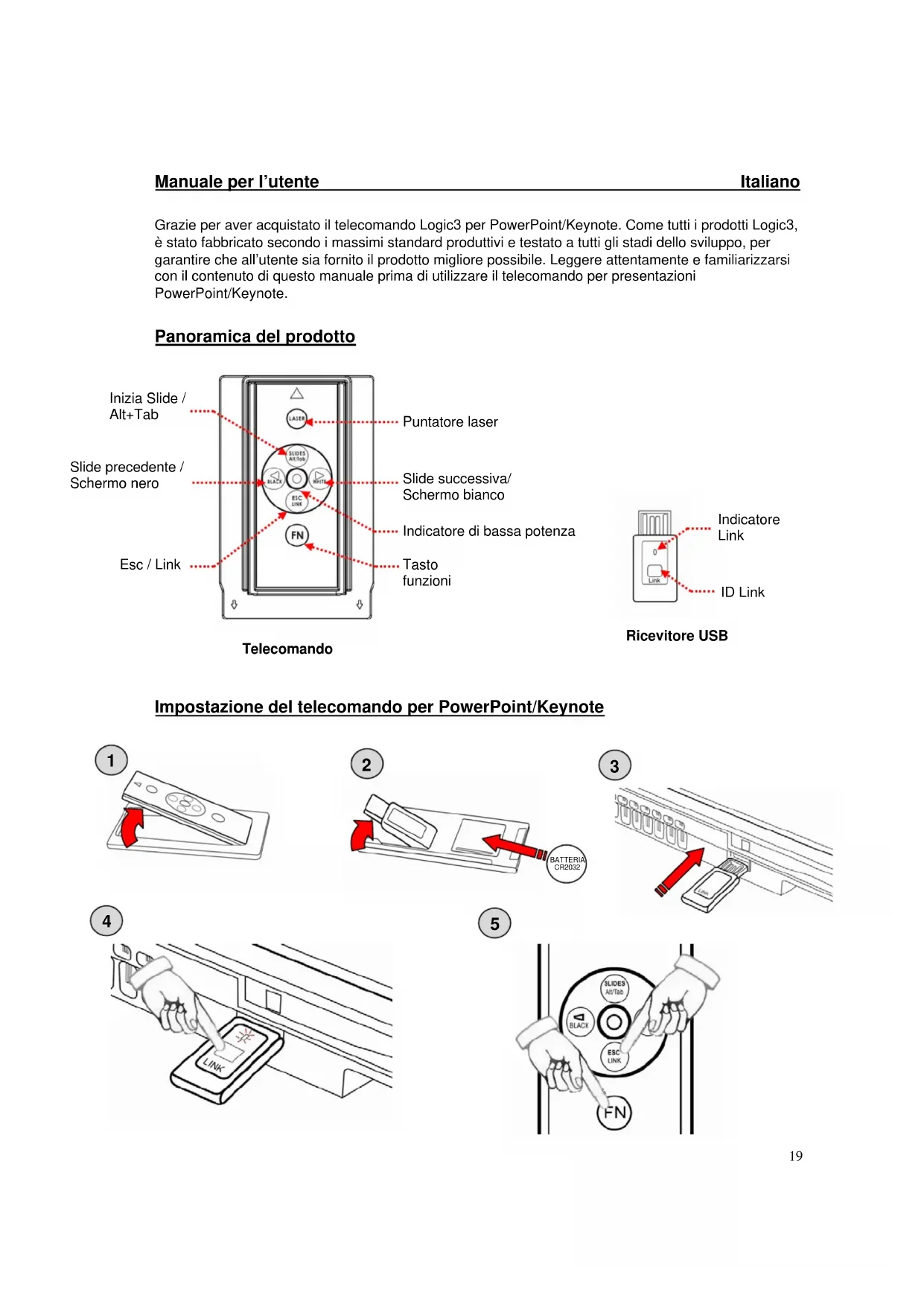Puntatore laser Inizia Slide / Alt+Tab Slide successiva/ Schermo bianco Indicatore di bassa potenza Slide precedente / Schermo nero Tasto funzioni Esc / Link Indicatore Link ID Link Ricevitore USB Telecomando BATTERIA CR203220 Manuale per l’utente Italiano Impostazione/Accoppiamento del telecomando per PowerPoint/Keynote