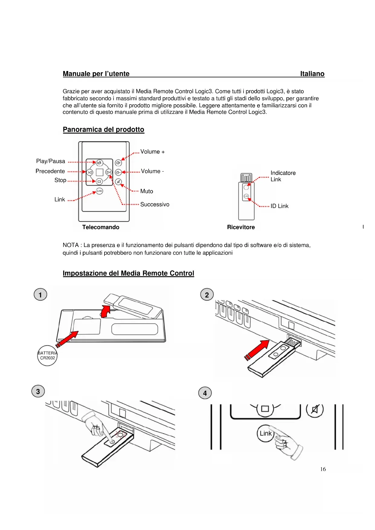 Grazie per aver acquistato il Media Remote Control Logic3. Come tutti i prodotti Logic3, è stato fabbricato secondo i massimi standard produttivi e testato a tutti gli stadi dello sviluppo, per garantire che all’utente sia fornito il prodotto migliore possibile. Leggere attentamente e familiarizzarsi con il contenuto di questo manuale prima di utilizzare il Media Remote Control Logic3. Panoramica del prodotto