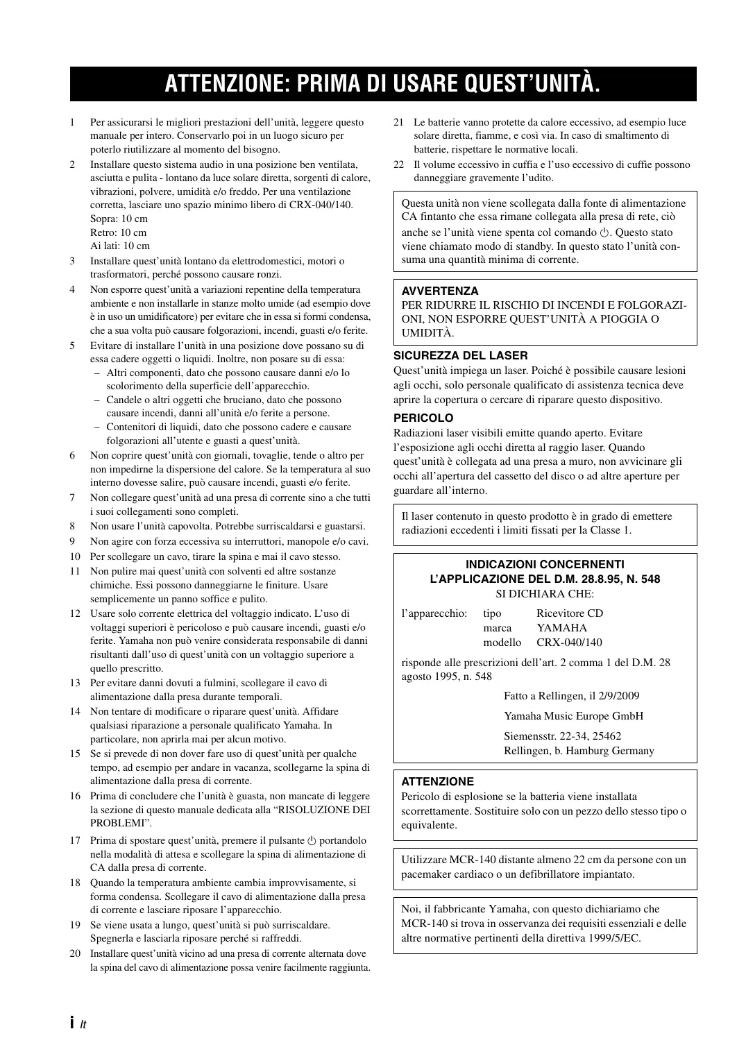 SI DICHIARA CHE: l’apparecchio: tipo marca modello Ricevitore CD YAMAHA CRX-040/140 risponde alle prescrizioni dell’art. 2 comma 1 del D.M. 28 agosto 1995, n. 548 Fatto a Rellingen, il 2/9/2009 Yamaha Music Europe GmbH Siemensstr. 22-34, 25462 Rellingen, b. Hamburg Germany ATTENZIONE Pericolo di esplosione se la batteria viene installata scorrettamente. Sostituire solo con un pezzo dello stesso tipo o equivalente. Utilizzare MCR-140 distante almeno 22 cm da persone con un pacemaker cardiaco o un defibrillatore impiantato. Noi, il fabbricante Yamaha, con questo dichiariamo che MCR-140 si trova in osservanza dei requisiti essenziali e delle altre normative pertinenti della direttiva 1999/5/EC. INDICE COMPONENTI ...................................................... 2