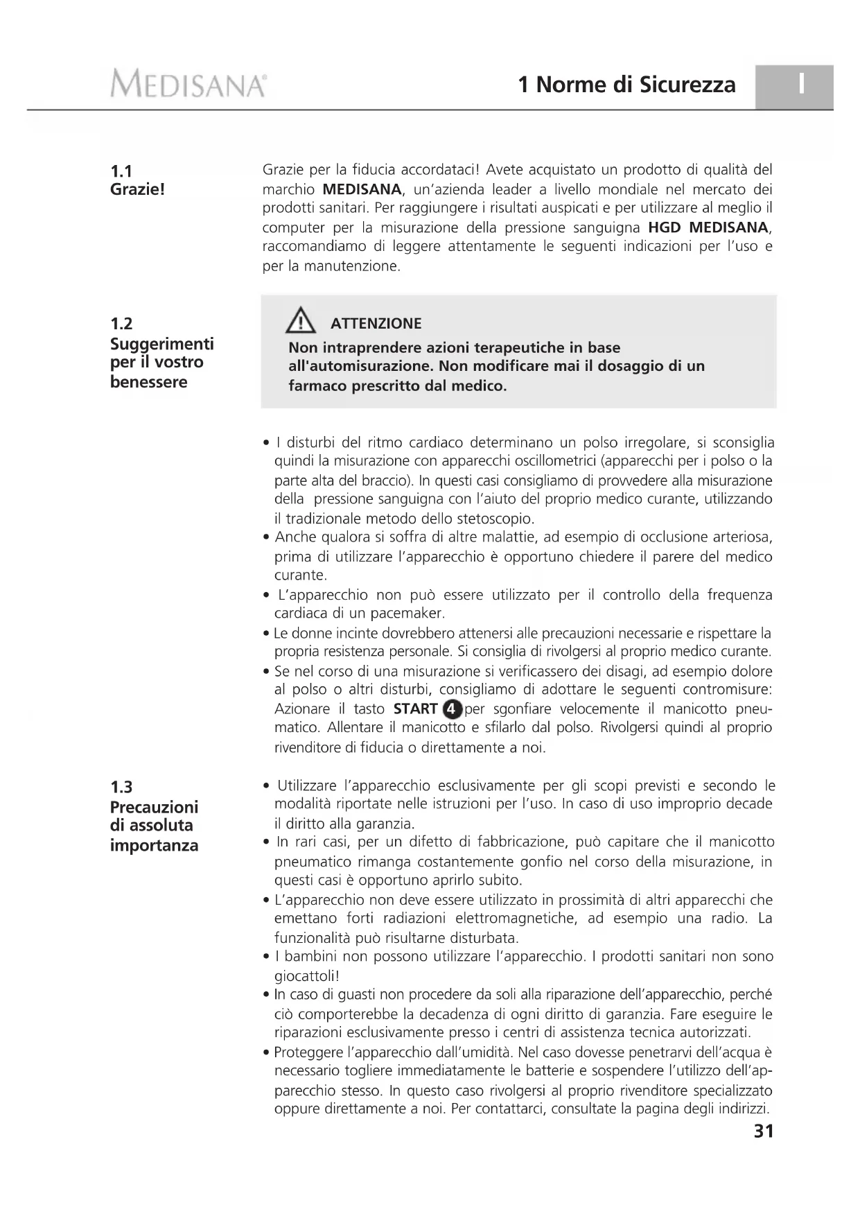 Suggerimenti per il vostro benessere Grazie per la fiducia accordataci! Avete acquistato un prodotto di qualità del marchio MEDISANA, un’azienda leader a livello mondiale nel mercato dei prodotti sanitari. Per raggiungere i risultati auspicati e per utilizzare al meglio il computer per la misurazione della pressione sanguigna HGD MEDISANA, raccomandiamo di leggere attentamente le seguenti indicazioni per l’uso e per la manutenzione. ATTENZIONE Non intraprendere azioni terapeutiche in base all'automisurazione. Non modificare mai il dosaggio di un farmaco prescritto dal medico.