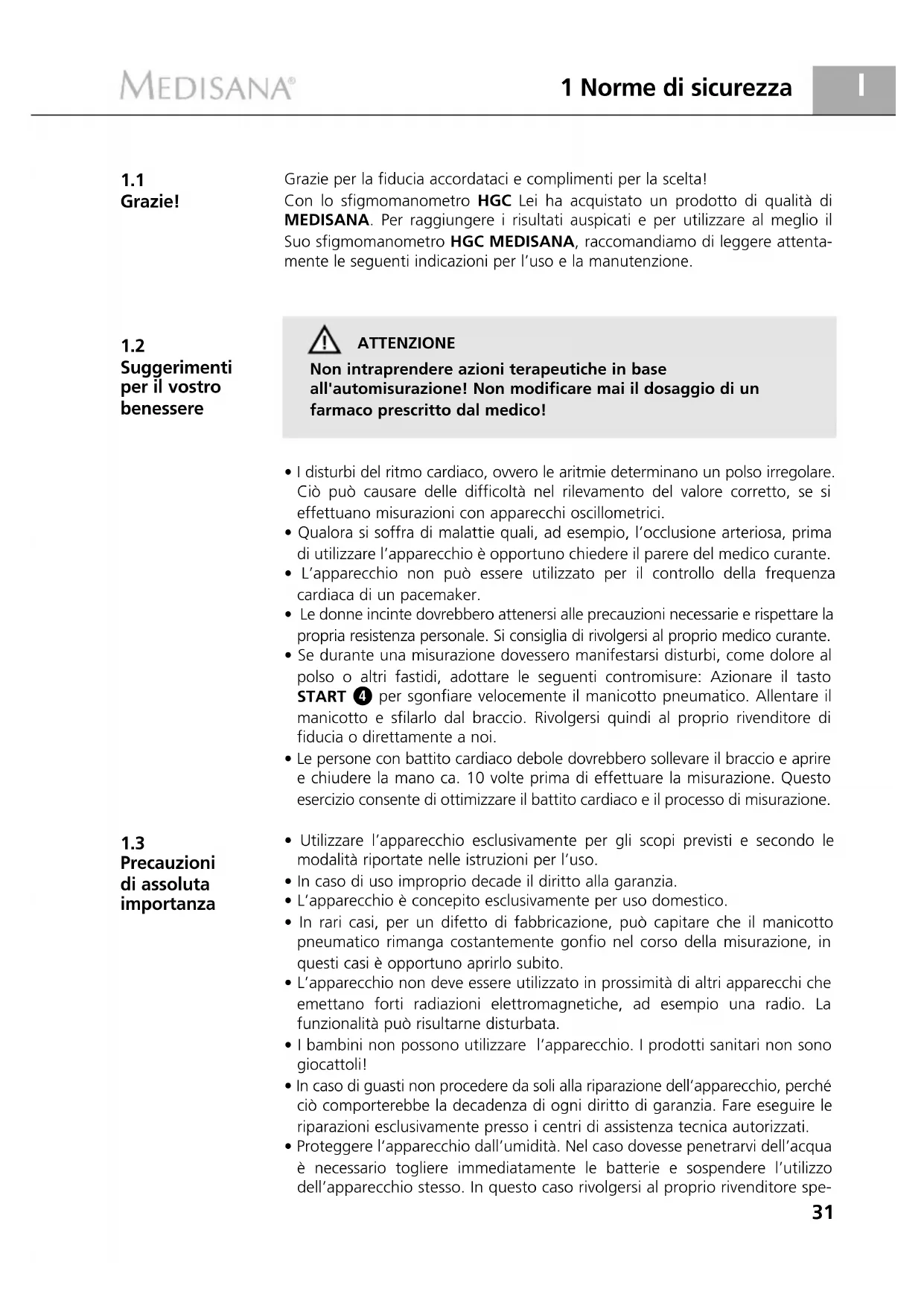 - 1 opuscolo d’istruzioni per l’uso Le confezioni sono riutilizzabili o possono essere riciclate. Smaltire il materiale d’imballaggio non più necessario in conformità alle disposizioni vigenti. In caso di danneggiamenti dovuti al trasporto, mettersi immediatamente in contatto con il proprio rivenditore. ATTENZIONE Assicurarsi che i sacchetti d’imballaggio non siano alla portata dei bambini. Pericolo di soffocamento! La pressione sanguigna è la pressione presente nei vasi sanguigni a ogni battito cardiaco. Quando il cuore si contrae (= sistole) e pompa il sangue nelle arterie, si ha un innalzamento di pressione, il cui valore massimo è definito pressione sistolica ed è il primo ad essere rilevato nel corso della misurazione della pressione sanguigna. Quando il muscolo cardiaco si allenta per ricevere nuovo sangue, scende anche la pressione nelle arterie. Ed è proprio nel momento in cui i vasi sanguigni sono rilassati che si misura il secondo valore, ovvero la pressione diastolica. HGC è uno sfigmomanometro destinato alla misurazione della pressione arteriosa sul polso. La misurazione avviene tramite un microprocessore che grazie a un sensore di pressione è in grado di valutare le oscillazioni della pressione che si verificano nelle arterie e che vengono rilevate gonfiando e sgonfiando il manicotto pneumatico. MEDISANA vanta un’esperienza pluriennale nel campo della misurazione della pressione sanguigna. L’elevata precisione del principio di misurazione degli apparecchi MEDISANA è provata da studi clinici, condotti sulla base di standard internazionali. Un valido argomento a favore della misurazione della pressione sanguigna a casa propria è dato dal fatto che le misurazioni sono effettuate in un ambiente familiare e in condizioni di relax. Particolarmente importante è il cosiddetto “valore base”, cioè quello rilevato al mattino appena svegli, prima della colazione. Sarebbe fondamentale misurare la propria pressione sanguigna possibilmente sempre alla stessa ora e nelle stesse condi- zioni. Ciò, infatti, consentirebbe di confrontare i risultati e di riconoscere per tempo disturbi iniziali dell’alta pressione. Se per molto tempo non ci si accorge di soffrire di alta pressione, aumenta il rischio di ulteriori malattie cardiovascolari.