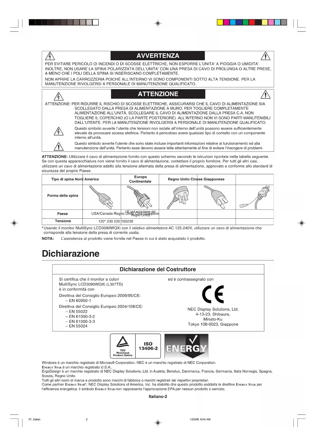 Mosaïque : MARCHEMosaïque : ARRET 06_French 1/25/08, 8:54 AM23Français-24 06_French 1/25/08, 8:54 AM24Italiano Italiano-1 Indice Avvertenza, Attenzione ............................................................................................................... Italiano-2 Dichiarazione .............................................................................................................................. Italiano-2 Raccomandazioni per l’uso ......................................................................................................... Italiano-3 Indice .......................................................................................................................................... Italiano-5 Guida rapida ............................................................................................................................... Italiano-6 Comandi...................................................................................................................................... Italiano-10 07_Italian 1/25/08, 8:54 AM1Italiano-2 AVVERTENZA ATTENZIONE ATTENZIONE: PER RIDURRE IL RISCHIO DI SCOSSE ELETTRICHE, ASSICURARSI CHE IL CAVO DI ALIMENTAZIONE SIA SCOLLEGATO DALLA PRESA DI ALIMENTAZIONE A MURO. PER TOGLIERE COMPLETAMENTE ALIMENTAZIONE ALL’UNITÀ, SCOLLEGARE IL CAVO DI ALIMENTAZIONE DALLA PRESA C.A. NON TOGLIERE IL COPERCHIO (O LA PARTE POSTERIORE). ALL’INTERNO NON VI SONO PARTI MANUTENIBILI DALL’UTENTE. PER LA MANUTENZIONE RIVOLGERSI A PERSONALE DI MANUTENZIONE QUALIFICATO. Questo simbolo avverte l’utente che tensioni non isolate all’interno dell’unità possono essere sufficientemente elevate da provocare scossa elettrica. Pertanto è pericoloso avere qualsiasi tipo di contatto con un componente interno all’unità. Questo simbolo avverte l’utente che sono state incluse importanti informazioni relative al funzionamento ed alla manutenzione dell’unità. Pertanto esse devono essere lette attentamente al fine di evitare l’insorgere di problemi. PER EVITARE PERICOLO DI INCENDI O DI SCOSSE ELETTRICHE, NON ESPORRE L’UNITA’ A PIOGGIA O UMIDITA’. INOLTRE, NON USARE LA SPINA POLARIZZATA DELL’UNITA’ CON UNA PRESA DI CAVO DI PROLUNGA O ALTRE PRESE, A MENO CHE I POLI DELLA SPINA SI INSERISCANO COMPLETAMENTE. NON APRIRE LA CARROZZERIA POICHÉ ALL’INTERNO VI SONO COMPONENTI SOTTO ALTA TENSIONE. PER LA MANUTENZIONE RIVOLGERSI A PERSONALE DI MANUTENZIONE QUALIFICATO. ATTENZIONE: Utilizzare il cavo di alimentazione fornito con questo schermo secondo le istruzioni riportate nella tabella seguente. Se con questa apparecchiatura non viene fornito il cavo di alimentazione, contattare il proprio fornitore. Per tutti gli altri casi, utilizzare un cavo di alimentazione adatto alla tensione alternata della presa di alimentazione, approvato e conforme allo standard di sicurezza del proprio Paese. Tipo di spina Nord AmericaEuropaContinentaleRegno Unito Cinese GiapponeseForma della spinaPaeseTensioneUSA/Canada Regno Unito Cina GiapponeUE (ad eccezione delRegno Unito)120* 230 220 100230 *Usando il monitor MultiSync LCD3090WQXi con il relativo alimentatore AC 125-240V, utilizzare un cavo di alimentazione che corrisponde alla tensione della presa di corrente usata. NOTA: L’assistenza al prodotto viene fornita nel Paese in cui è stato acquistato il prodotto. Dichiarazione Dichiarazione del Costruttore Si certifica che il monitor a colori MultiSync LCD3090WQXi (L307TD) è in conformità con Direttiva del Consiglio Europeo 2006/95/CE: – EN 60950-1 Direttiva del Consiglio Europeo 2004/108/CE: – EN 55022 – EN 61000-3-2 – EN 61000-3-3 – EN 55024 ed è contrassegnato con NEC Display Solutions, Ltd. 4-13-23, Shibaura, Minato-Ku Tokyo 108-0023, Giappone Windows è un marchio registrato di Microsoft Corporation. NEC è un marchio registrato di NEC Corporation. ENERGY STAR è un marchio registrato U.S.A.. ErgoDesign è un marchio registrato di NEC Display Solutions, Ltd. in Austria, Benelux, Danimarca, Francia, Germania, Italia Norvegia, Spagna, Svezia, Regno Unito.Tutti gli altri nomi di marca e prodotto sono marchi di fabbrica o marchi registrati dei rispettivi proprietari. Come partner ENERGY STAR