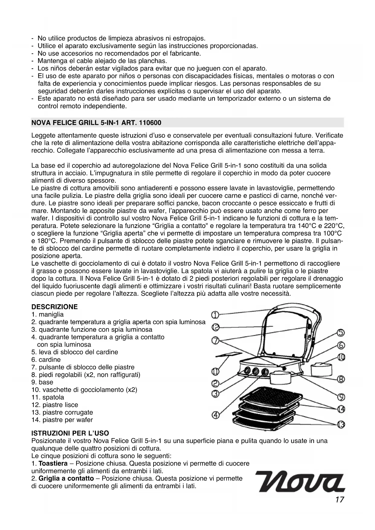 Leggete attentamente queste istruzioni d’uso e conservatele per eventuali consultazioni future. Verificate che la rete di alimentazione della vostra abitazione corrisponda alle caratteristiche elettriche dell’appa- recchio. Collegate l’apparecchio esclusivamente ad una presa di alimentazione con messa a terra. La base ed il coperchio ad autoregolazione del Nova Felice Grill 5-in-1 sono costituiti da una solida struttura in acciaio. L’impugnatura in stile permette di regolare il coperchio in modo da poter cuocere alimenti di diverso spessore. Le piastre di cottura amovibili sono antiaderenti e possono essere lavate in lavastoviglie, permettendo una facile pulizia. Le piastre della griglia sono ideali per cuocere carne e pasticci di carne, nonché ver- dure. Le piastre sono ideali per preparare soffici pancke, bacon croccante o pesce essiccato e frutti di mare. Montando le apposite piastre da wafer, l’apparecchio può essere usato anche come ferro per wafer. I dispositivi di controllo sul vostro Nova Felice Grill 5-in-1 indicano le funzioni di cottura e la tem- peratura. Potete selezionare la funzione “Griglia a contatto" e regolare la temperatura tra 140°C e 220°C, o scegliere la funzione “Griglia aperta” che vi permette di impostare un temperatura compresa tra 100°C e 180°C. Premendo il pulsante di sblocco delle piastre potete sganciare e rimuovere le piastre. Il pulsan- te di sblocco del cardine permette di ruotare completamente indietro il coperchio, per usare la griglia in posizione aperta. Le vaschette di gocciolamento di cui è dotato il vostro Nova Felice Grill 5-in-1 permettono di raccogliere il grasso e possono essere lavate in lavastoviglie. La spatola vi aiuterà a pulire la griglia o le piastre dopo la cottura. Il Nova Felice Grill 5-in-1 è dotato di 2 piedi posteriori regolabili per regolare il drenaggio del liquido fuoriuscente dagli alimenti e ottimizzare i vostri risultati culinari! Basta ruotare semplicemente ciascun piede per regolare l’altezza. Scegliete l’altezza più adatta alle vostre necessità. DESCRIZIONE