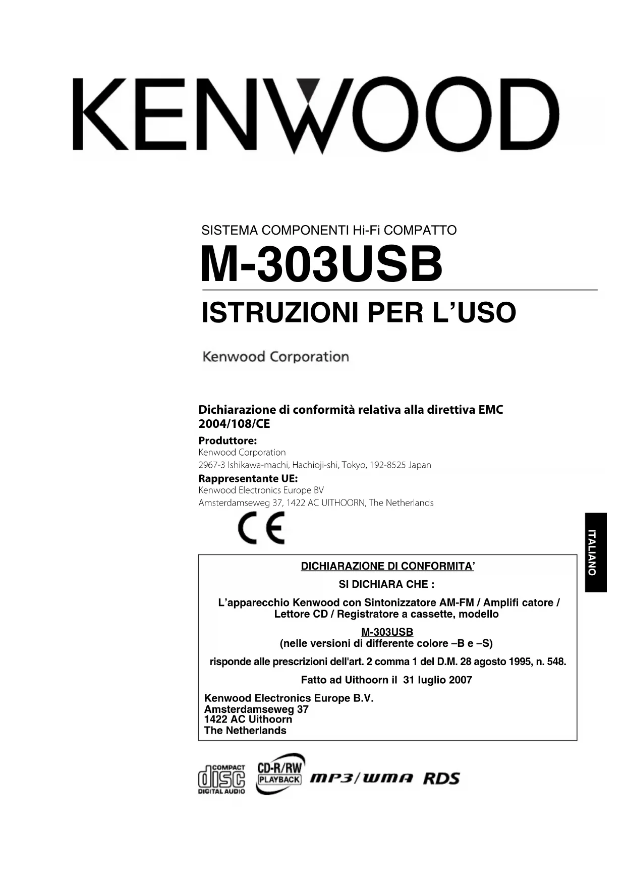 B60-5692-0800FDNIE.indb24B60-5692-0800FDNIE.indb24 07.9.116:38:22PM07.9.116:38:22PMITALIANO SISTEMA COMPONENTI Hi-Fi COMPATTO M-303USB ISTRUZIONI PER L’USO DICHIARAZIONE DI CONFORMITA’SI DICHIARA CHE :L’apparecchio Kenwood con Sintonizzatore AM-FM / Amplifi catore / Lettore CD / Registratore a cassette, modelloM-303USB(nelle versioni di differente colore –B e –S)risponde alle prescrizioni dell'art. 2 comma 1 del D.M. 28 agosto 1995, n. 548.Fatto ad Uithoorn il 31 luglio 2007Kenwood Electronics Europe B.V.Amsterdamseweg 371422 AC UithoornThe Netherlands Dichiarazione di conformità relativa alla direttiva EMC