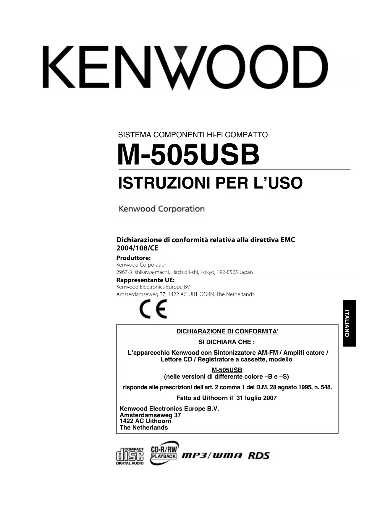 2004/108/CE Produttore: Kenwood Corporation2967-3 Ishikawa-machi, Hachioji-shi, Tokyo, 192-8525 Japan Rappresentante UE: Kenwood Electronics Europe BVAmsterdamseweg 37, 1422 AC UITHOORN, The Netherlands M-505USBITr9.indd1M-505USBITr9.indd1 07.8.293:38:00PM07.8.293:38:00PM2