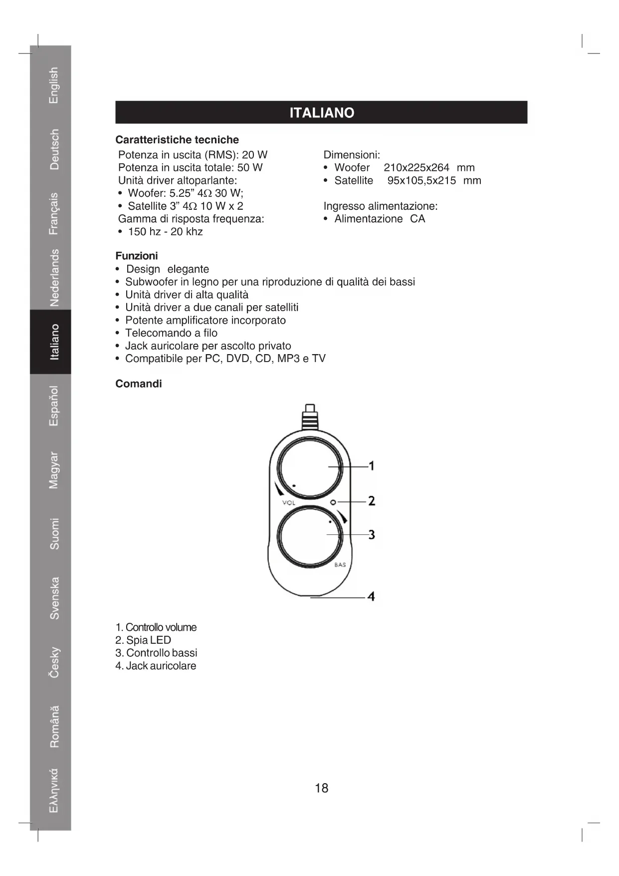 ELETTRICHE NON APRIRE ATTENZIONE Per ridurre il rischio di scosse elettriche, questo prodotto deve essere aperto ESCLUSIVAMENTE da personale tecnico specializzato, se occorre assistenza. Se si dovessero verificare dei problemi, scollegare il prodotto dall'alimentazione di rete e da ogni altra apparecchiatura. Non esporre il prodotto ad acqua o umidità. Manutenzione: Pulire solo con un panno asciutto. Non utilizzare solventi detergenti o abrasivi. Garanzia: Non sarà accettata alcuna garanzia o responsabilità in relazione a cambiamenti e modifiche del prodotto o a danni determinati dall'uso non corretto del prodotto stesso. Generalità: Il design e le caratteristiche tecniche sono soggetti a modifica senza necessità di preavviso. Tutti i marchi a logo e i nomi di prodotto sono marchi commerciali o marchi registrati appartenenti ai rispettivi titolari e sono in questo documento riconosciuti come tali. Conservare il presente manuale da consultare in occasioni future. Attenzione: Il prodotto è contrassegnato con questo simbolo, con il quale si indica che i prodotti elettrici ed elettronici usati non devono essere gettati insieme ai rifiuti domestici. Per questi prodotti esiste un sistema di raccolta differenziata. Copyright ©22 ESPAÑOL ESPECIFICACIONES Corriente de salida (RMS): 20W Corriente de salida total: 50W Unidad del piloto del altavoz: