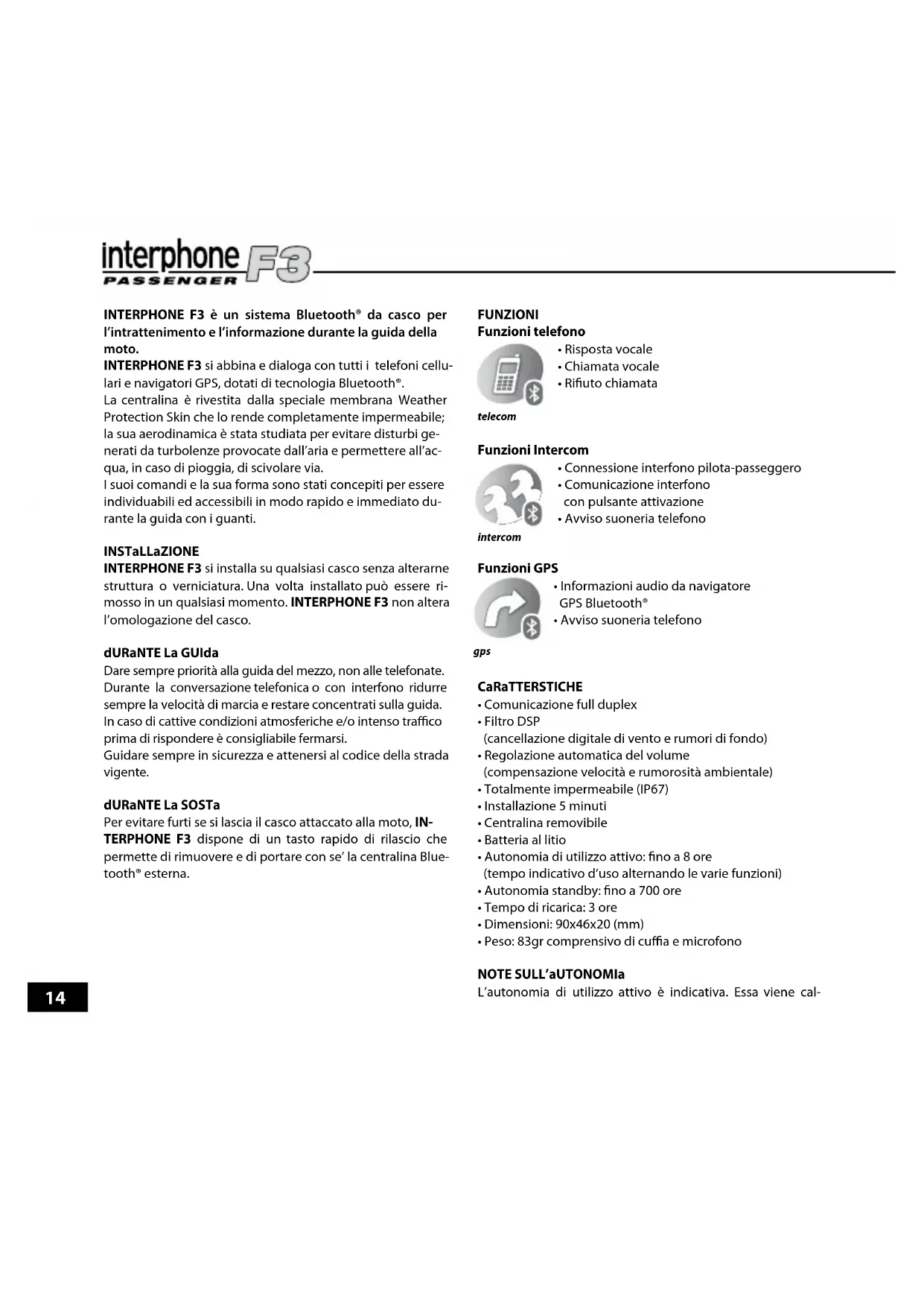 Durante la comunicazione Intercom uno dei due dispositivi Interphone o INTERPHONE F3 ha un consumo maggiore di batterie: quello fenomeno è dovuto alla procedura di ricerca wireless che una delle centraline svolge per restare agganciata all'altra e può essere portare ad una differenza di autonoma di 60/90 minuti.