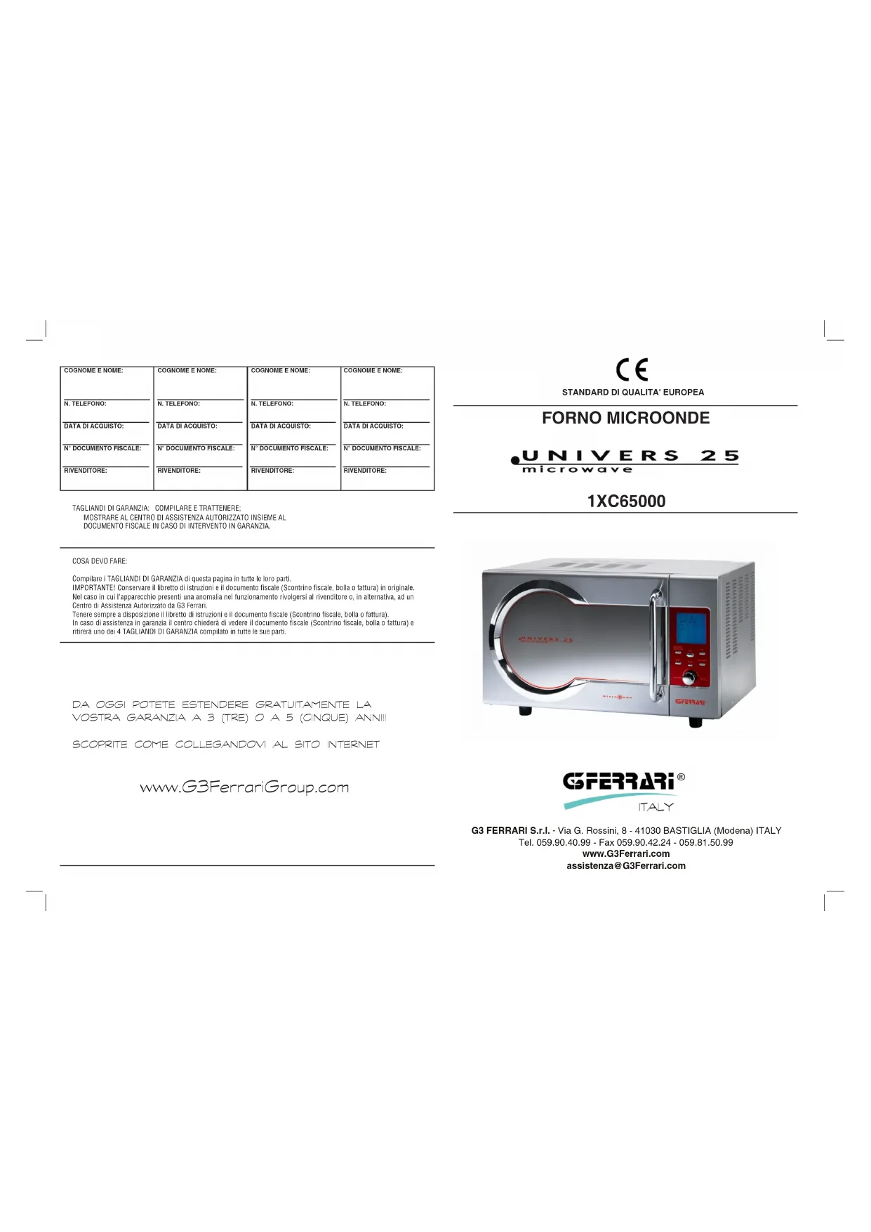CONDIZIONI DI GARANZIA: L'apparecchio è coperto da GARANZIA commerciale per un periodo di un anno dalla data di acquisto. E' prevista una estensione per un secondo anno di GARANZIA ai soli clienti consumatori, ai sensi del D.Lgs. nr. 24 del 02/02/2002, che denisce come consumatore qualsiasi persona sica che, nel contratto, agisce per scopi estranei all'attività imprenditoriale o professionale eventualmente svolta. La validità della GARANZIA deve essere sempre comprovata da un documento scale (Scontrino scale, bolla o fattura) e copre esclusivamente tutti i componenti che risultano difettosi all'origine per vizi di fabbricazione. I vizi di fabbricazione che si manifestano entro sei mesi dalla consegna, salvo prova contraria o incompatibilità con la natura del bene, si presumono già esistenti alla data della consegna. Sono quindi escluse tutte le parti che hanno subito rotture accidentali o che sono soggette ad usura, difetti derivanti da un utilizzo non domestico dell'apparecchio, negligenza nell'uso o nella manutenzione, danni da trasporto e tutti quei danni non direttamente imputabili alla G3 FERRARI. L'apparecchio deve essere riparato esclusivamente da personale autorizzato da G3 FERRARI; l'eventuale manomissione da parte di personale non autorizzato farà decadere la GARANZIA. Le riparazioni vengono effettuate gratuitamente presso G3 Ferrari o presso uno dei Centri di Assistenza Tecnica autorizzati da G3 Ferrari. Qualora dovesse manifestarsi un difetto di conformità nel prodotto G3 Ferrari dopo il sesto mese dalla consegna, l'utente nale che può usufruire della garanzia ai sensi del suddetto D.Lgs. dovrà rivolgersi al rivenditore o, in alternativa, ad un Centro di Assistenza Autorizzato da G3 Ferrari allegando la seguente documentazione: - Scontrino scale, bolla o fattura {dal 13° mese solo con scontrino scale comprovante che il prodotto sia stato acquistato da un consumatore}. - Prova che si tratti di un difetto che la legge classica nella categoria "difetti di conformità". - Prova che tale difetto sia imputabile alla G3 Ferrari. In mancanza di quanto sopra descritto il ripristino delle funzionalità sarà eseguito a pagamento. Il consumatore resta in ogni caso titolare dei diritti secondo la propria legislazione nazionale applicabile disciplinante la vendita dei beni di consumo. Questa GARANZIA lascia impregiudicati tali diritti. G3 Ferrari resta sempre a disposizione per fornire qualsiasi tipo di chiarimento scrivendo a: G3 FERRARI SERVIZIO ASSISTENZA VIA ROSSINI 8 41030 BASTIGLIA MO oppure mandando una email ad assistenza@G3Ferrari.com oppure inviando un fax allo 059/815099
