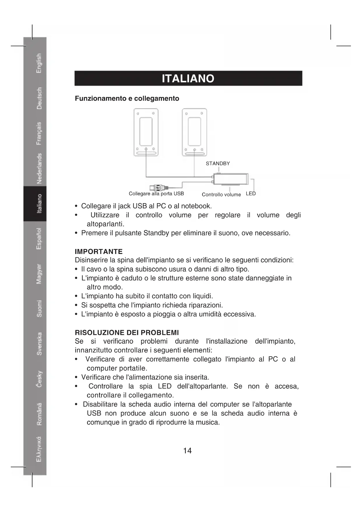 - Premere il pulsante Standby per eliminare il suono, ove necessario. IMPORTANTE Disinserire la spina dell'impianto se si verificano le seguenti condizioni: