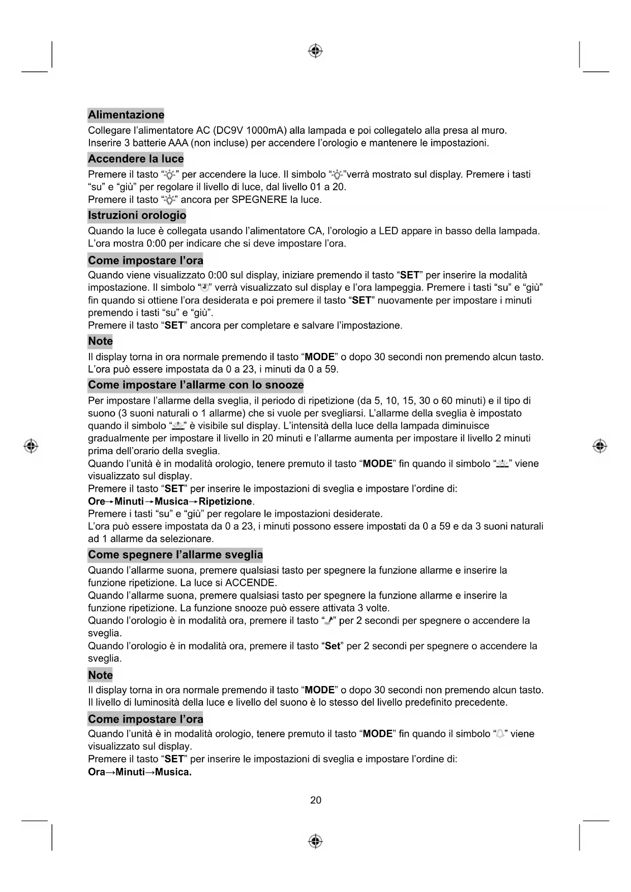 RIPETIZI- ONE SLEEP ALTOPARL- ANTE LUMINOSITA’ DEGLI LCD SVEGLIA FM20 Alimentazione Collegare l’alimentatore AC (DC9V 1000mA) alla lampada e poi collegatelo alla presa al muro. Inserire 3 batterie AAA (non incluse) per accendere l’orologio e mantenere le impostazioni. Accendere la luce Premere il tasto “ ” per accendere la luce. Il simbolo “ ”verrà mostrato sul display. Premere i tasti “su” e “giù” per regolare il livello di luce, dal livello 01 a 20. Premere il tasto “ ” ancora per SPEGNERE la luce. Istruzioni orologio Quando la luce è collegata usando l’alimentatore CA, l’orologio a LED appare in basso della lampada. L’ora mostra 0:00 per indicare che si deve impostare l’ora. Come impostare l’ora Quando viene visualizzato 0:00 sul display, iniziare premendo il tasto “SET” per inserire la modalità impostazione. Il simbolo “ ” verrà visualizzato sul display e l’ora lampeggia. Premere i tasti “su” e “giù” fin quando si ottiene l’ora desiderata e poi premere il tasto “SET” nuovamente per impostare i minuti premendo i tasti “su” e “giù”. Premere il tasto “SET” ancora per completare e salvare l’impostazione. Note Il display torna in ora normale premendo il tasto “MODE” o dopo 30 secondi non premendo alcun tasto. L’ora può essere impostata da 0 a 23, i minuti da 0 a 59. Come impostare l’allarme con lo snooze Per impostare l’allarme della sveglia, il periodo di ripetizione (da 5, 10, 15, 30 o 60 minuti) e il tipo di suono (3 suoni naturali o 1 allarme) che si vuole per svegliarsi. L’allarme della sveglia è impostato quando il simbolo “ ” è visibile sul display. L’intensità della luce della lampada diminuisce gradualmente per impostare il livello in 20 minuti e l’allarme aumenta per impostare il livello 2 minuti prima dell’orario della sveglia. Quando l’unità è in modalità orologio, tenere premuto il tasto “MODE” fin quando il simbolo “ ” viene visualizzato sul display. Premere il tasto “SET” per inserire le impostazioni di sveglia e impostare l’ordine di: Ore