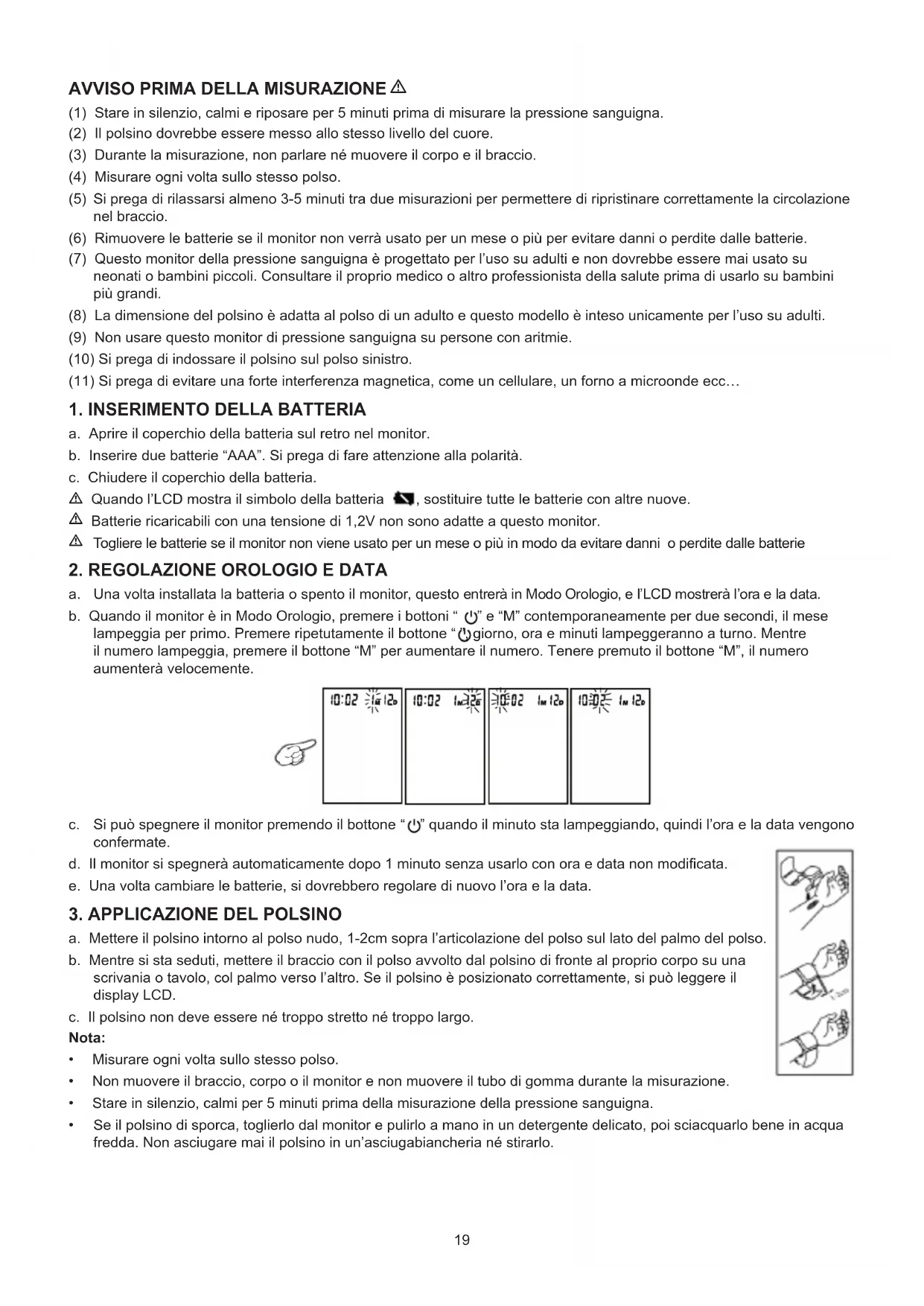 (1) Stare in silenzio, calmi e riposare per 5 minuti prima di misurare la pressione sanguigna. (2) Il polsino dovrebbe essere messo allo stesso livello del cuore. (3) Durante la misurazione, non parlare né muovere il corpo e il braccio. (4) Misurare ogni volta sullo stesso polso. (5) Si prega di rilassarsi almeno 3-5 minuti tra due misurazioni per permettere di ripristinare correttamente la circolazione nel braccio. (6) Rimuovere le batterie se il monitor non verrà usato per un mese o più per evitare danni o perdite dalle batterie. (7) Questo monitor della pressione sanguigna è progettato per l’uso su adulti e non dovrebbe essere mai usato su neonati o bambini piccoli. Consultare il proprio medico o altro professionista della salute prima di usarlo su bambini più grandi. (8) La dimensione del polsino è adatta al polso di un adulto e questo modello è inteso unicamente per l’uso su adulti. (9) Non usare questo monitor di pressione sanguigna su persone con aritmie. (10) Si prega di indossare il polsino sul polso sinistro. (11) Si prega di evitare una forte interferenza magnetica, come un cellulare, un forno a microonde ecc…