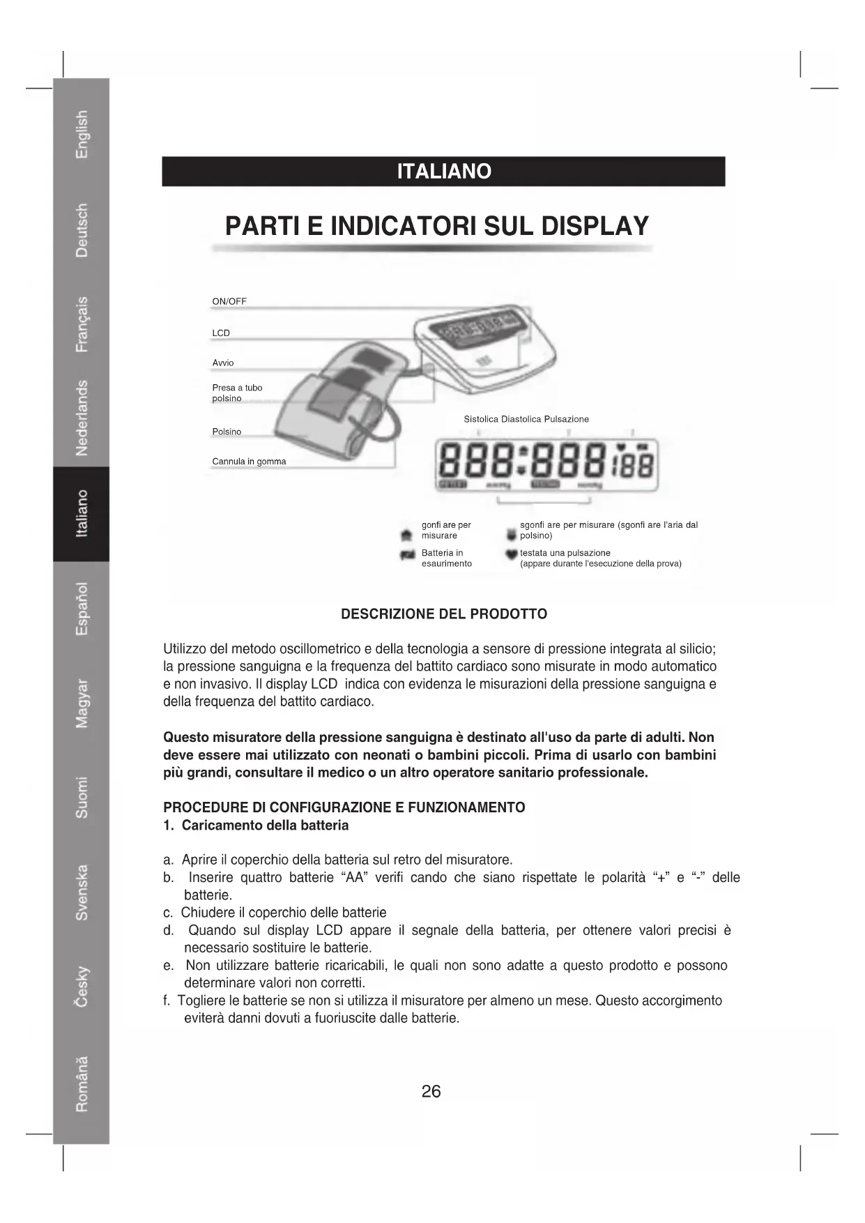Utilizzo del metodo oscillometrico e della tecnologia a sensore di pressione integrata al silicio; la pressione sanguigna e la frequenza del battito cardiaco sono misurate in modo automatico e non invasivo. Il display LCD indica con evidenza le misurazioni della pressione sanguigna e della frequenza del battito cardiaco. Questo misuratore della pressione sanguigna è destinato all'uso da parte di adulti. Non deve essere mai utilizzato con neonati o bambini piccoli. Prima di usarlo con bambini più grandi, consultare il medico o un altro operatore sanitario professionale.