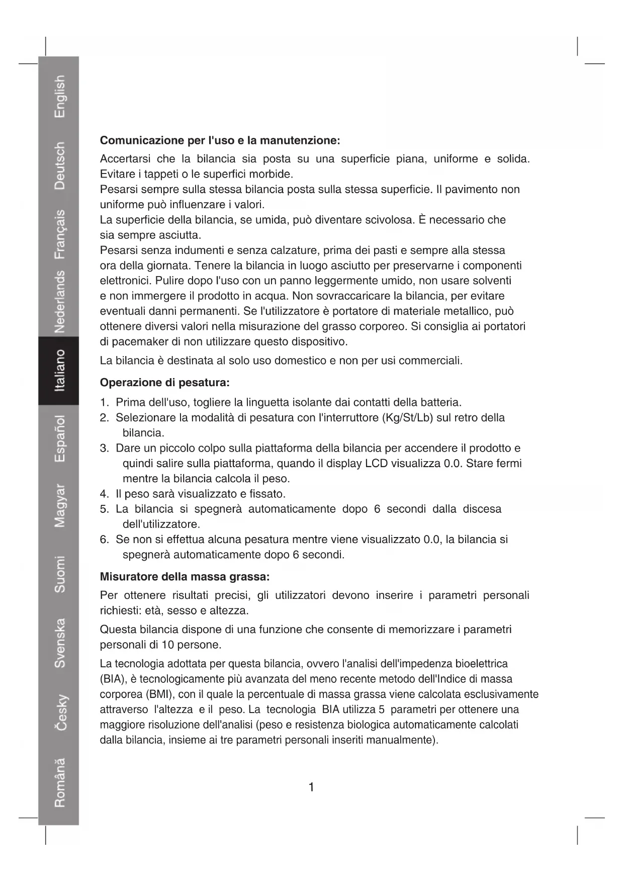 Bilancia pesapersone1 Comunicazione per l'uso e la manutenzione: Accertarsi che la bilancia sia posta su una supercie piana, uniforme e solida. Evitare i tappeti o le superci morbide. Pesarsi sempre sulla stessa bilancia posta sulla stessa supercie. Il pavimento non uniforme può inuenzare i valori. La supercie della bilancia, se umida, può diventare scivolosa. È necessario che sia sempre asciutta. Pesarsi senza indumenti e senza calzature, prima dei pasti e sempre alla stessa ora della giornata. Tenere la bilancia in luogo asciutto per preservarne i componenti elettronici. Pulire dopo l'uso con un panno leggermente umido, non usare solventi e non immergere il prodotto in acqua. Non sovraccaricare la bilancia, per evitare eventuali danni permanenti. Se l'utilizzatore è portatore di materiale metallico, può ottenere diversi valori nella misurazione del grasso corporeo. Si consiglia ai portatori di pacemaker di non utilizzare questo dispositivo. La bilancia è destinata al solo uso domestico e non per usi commerciali. Operazione di pesatura: