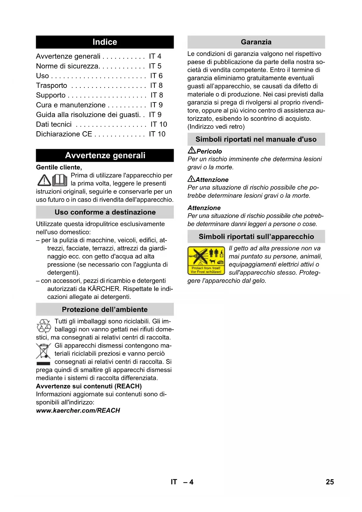 Estrarre il cavo prolunga sempre completa- mente dall'avvolgicavo. I tubi flessibili alta pressione, i raccordi e i giunti di accoppiamento sono importanti per la sicurezza dell'apparecchio. Utilizzare esclusivamente tubi flessibili alta pressione, raccordi e giunti di sicurezza raccomandati dal produttore. Questo apparecchio non è indicato ad esse- re utilizzato da persone con limitate capacità fisiche, sensoriali o mentali. L'apparecchio non deve essere utilizzato da bambini e da persone non autorizzate. I bambini devono essere sorvegliati affinché non giochino con l'apparecchio. Tenere le pellicole di imballaggio fuori dalla portata dei bambini. Rischio di asfissia! Questo apparecchio è stato concepito per essere utilizzato con i detergenti forniti dal produttore o da esso raccomandati. L'utilizzo di altri detergenti o agenti chimici può com- promettere la sicurezza dell'apparecchio. L'operatore deve utilizzare l'apparecchio in modo conforme a destinazione. Deve tener conto delle condizioni presenti in loco e du- rante il lavoro con l'apparecchio fare atten- zione alle persone nelle vicinanze. Non utilizzare l'apparecchio in presenza di persone nelle immediate vicinanze, a meno che non indossino gli indumenti protettivi adeguati. Per proteggersi dagli spruzzi d'acqua o di sporco indossare indumenti e occhiali di pro- tezione adatti. Attenzione In caso di pause di esercizio prolungate di- sattivare l'apparecchio dall'interruttore prin- cipale / interruttore dell'apparecchio o tirare la spina di rete. Non utilizzare l'apparecchio in caso di tem- perature inferiori a 0 °C. Mantenere una distanza minima di 30 cm del getto durante la pulizia di superfici vernicia- te, in modo da evitare danneggiamenti. Norme di sicurezza 26 IT– 6