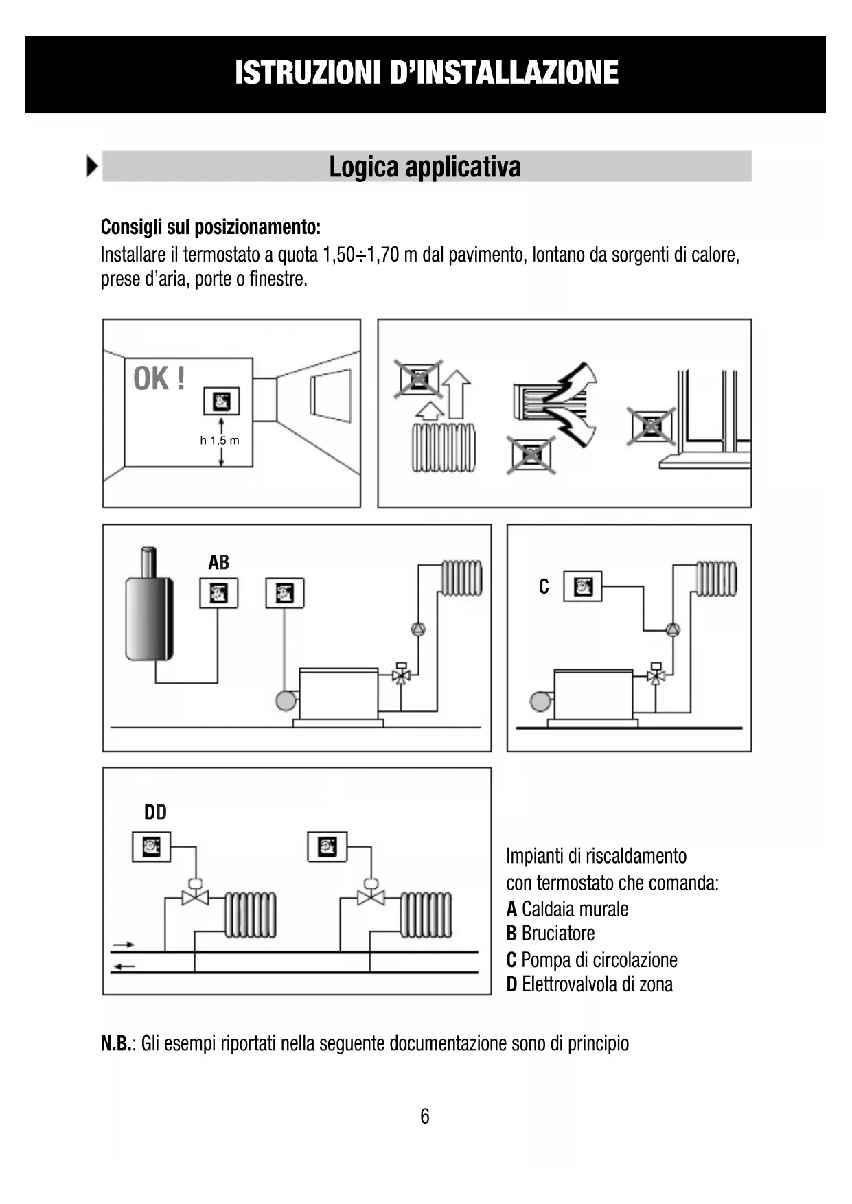 Installare il termostato a quota 1,50 ÷ 1,70 m dal pavimento, lontano da sorgenti di calore, prese d'aria, porte o finestre.