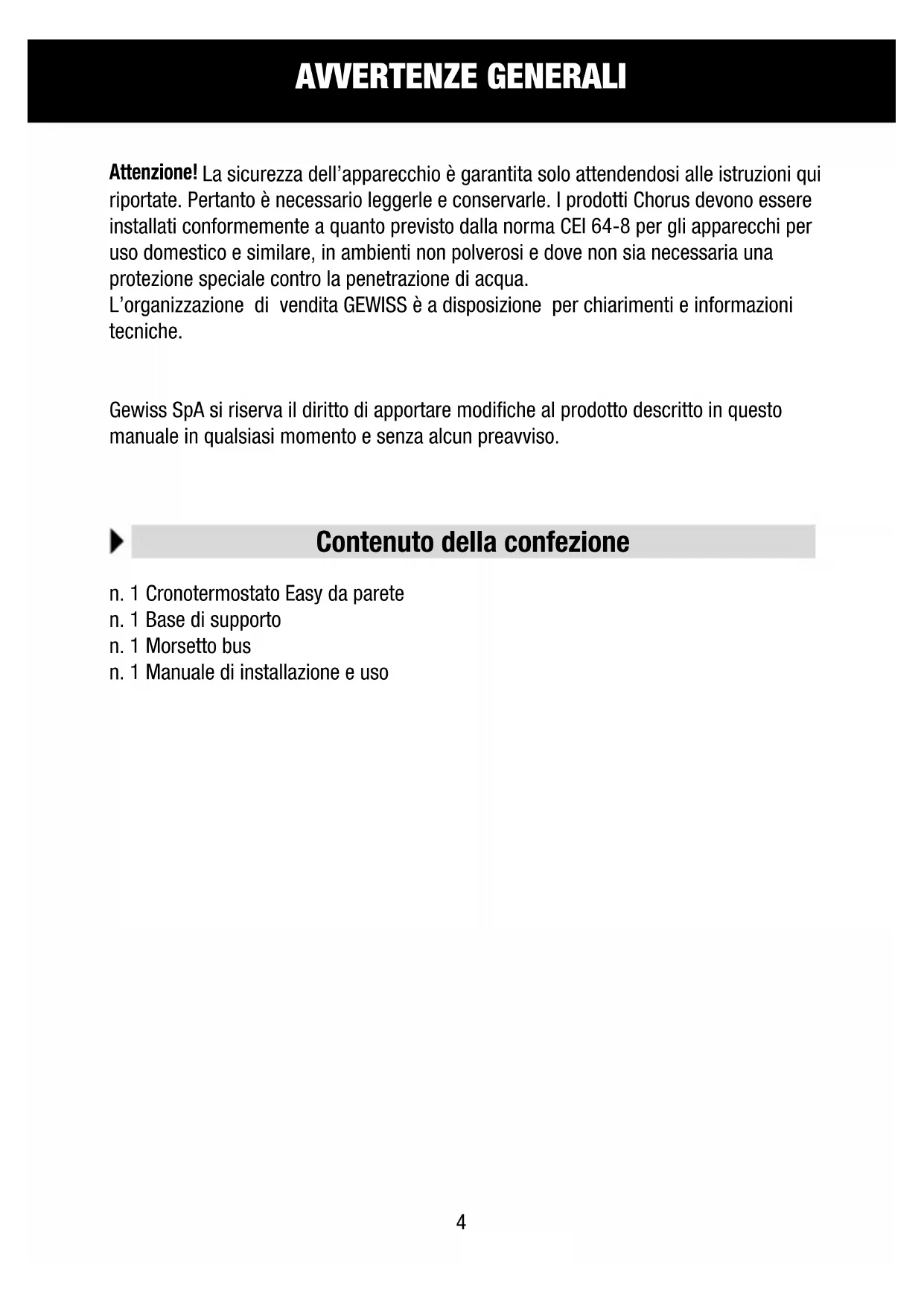 OAttenzione! La sicurezza dell’apparecchio è garantita solo attendendosi alle istruzioni qui riportate. Pertanto è necessario leggerle e conservarle. I prodotti Chorus devono essere installati conformemente a quanto previsto dalla norma CEI 64-8 per gli apparecchi per uso domestico e similare, in ambienti non polverosi e dove non sia necessaria una protezione speciale contro la penetrazione di acqua. L’organizzazione di vendita GEWISS è a disposizione per chiarimenti e informazioni tecniche. Gewiss SpA si riserva il diritto di apportare modifiche al prodotto descritto in questo manuale in qualsiasi momento e senza alcun preavviso. n. 1 Cronotermostato Easy da parete n. 1 Base di supporto n. 1 Morsetto bus n. 1 Manuale di installazione e uso AVVERTENZE GENERALI