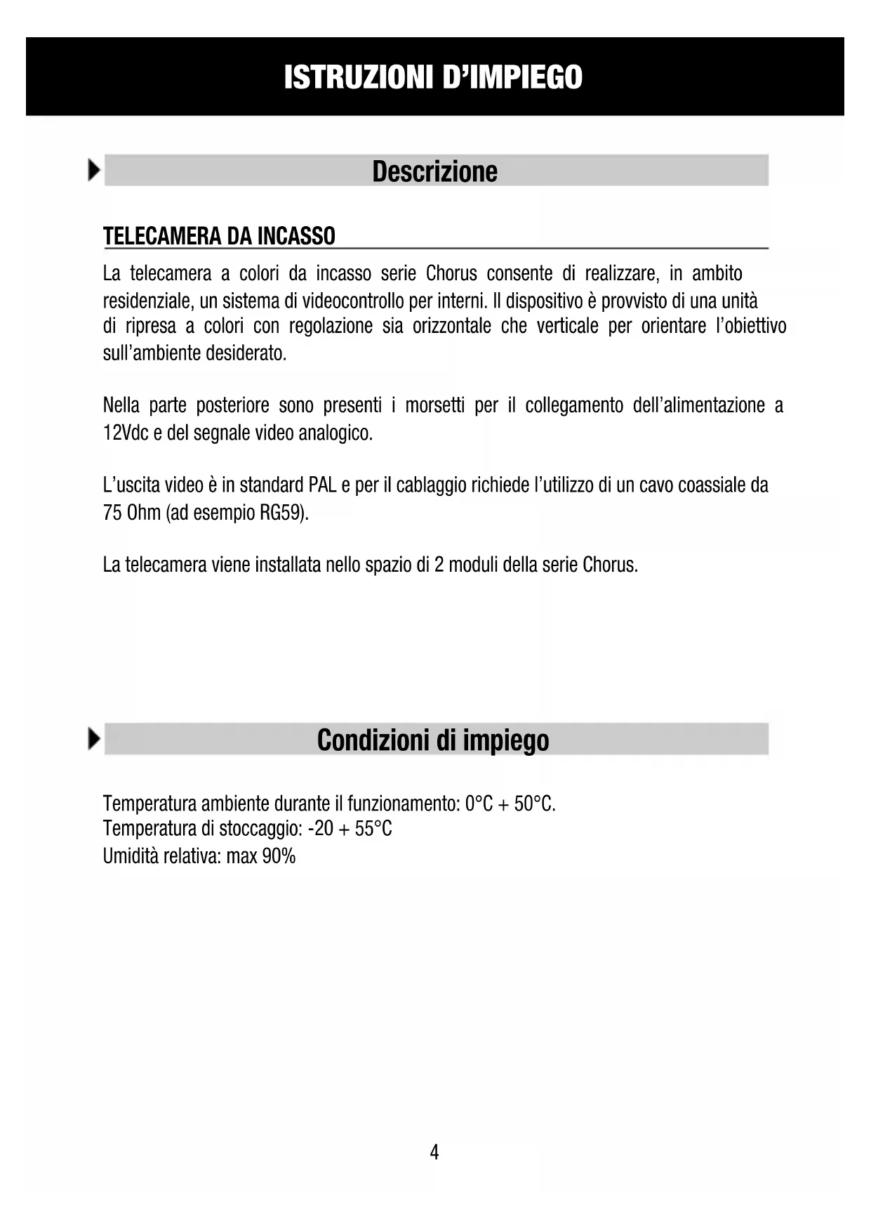 La telecamera a colori da incasso serie Chorus consente di realizzare, in ambito residenziale, un systema di videocontrollo per interni. Il dispositorio è provvisto di una unità di ripresa a colori con regolazione sua orizzontale che verticale per orientare l'obiettivo sull'ambiente desiderato.