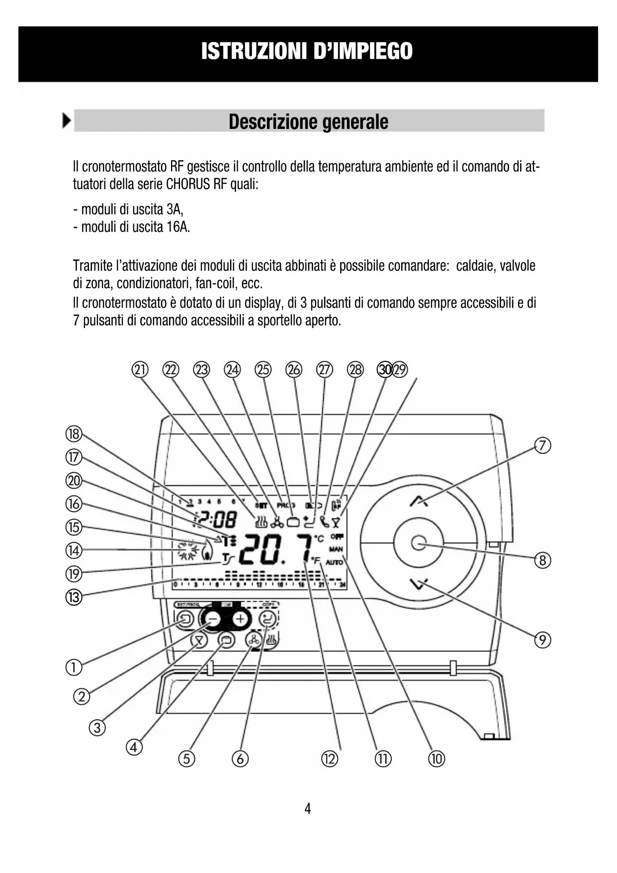 Il cronotermostato è dotato di un display, di 3 pulsanti di lavoro sempre accessibili e di 7 pulsanti di lavoro accessibili a sportello aperto.
