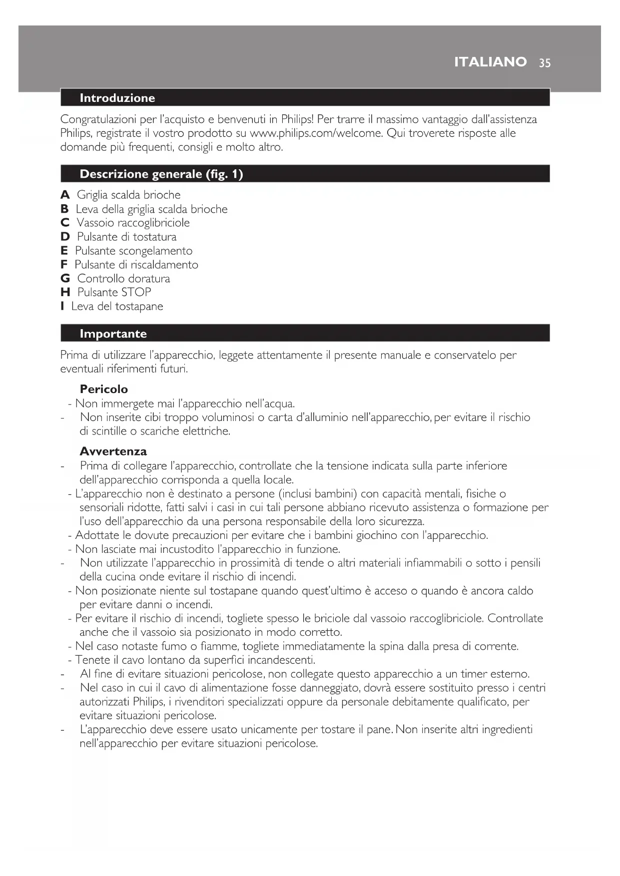 H Pulsante STOP I Leva del tostapane